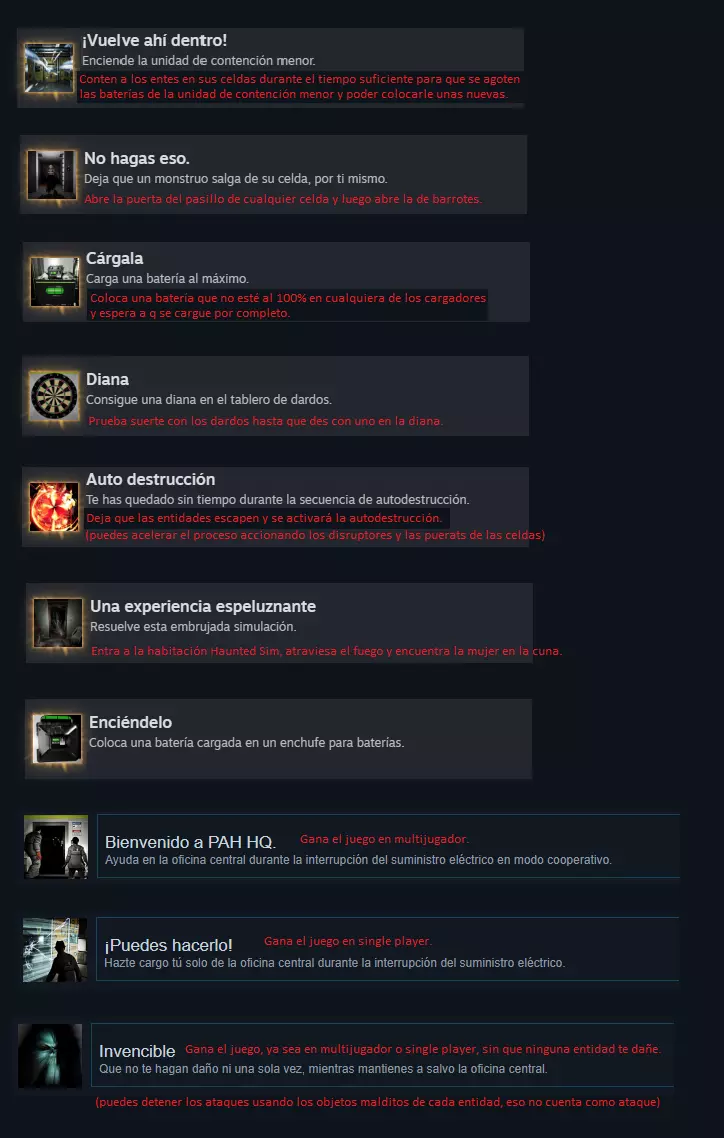 成就 部分成就可能仅对游戏主机(房主)生效,例如“Auto destrucción”“¡Vuelve ahí dentro!”以及隐藏成就。
