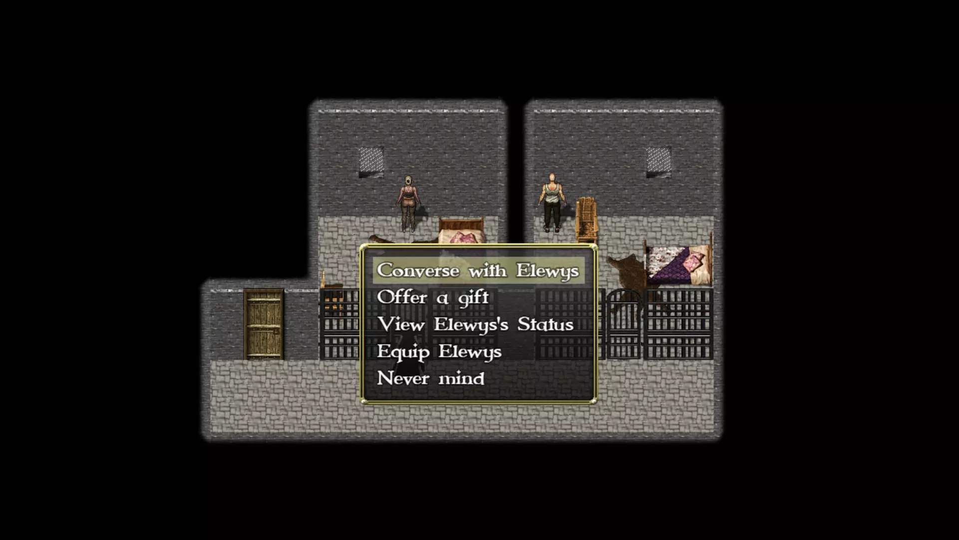 完成购买后,前往屏幕边缘退出并返回地图模式。在此界面点击屏幕左上角的【牢房】图标。是时候去看看你那些友好的战斗奴隶了! 牢房 *与你的奴隶交谈*