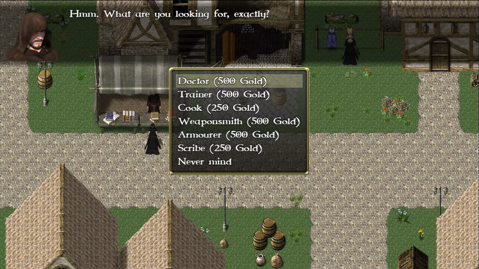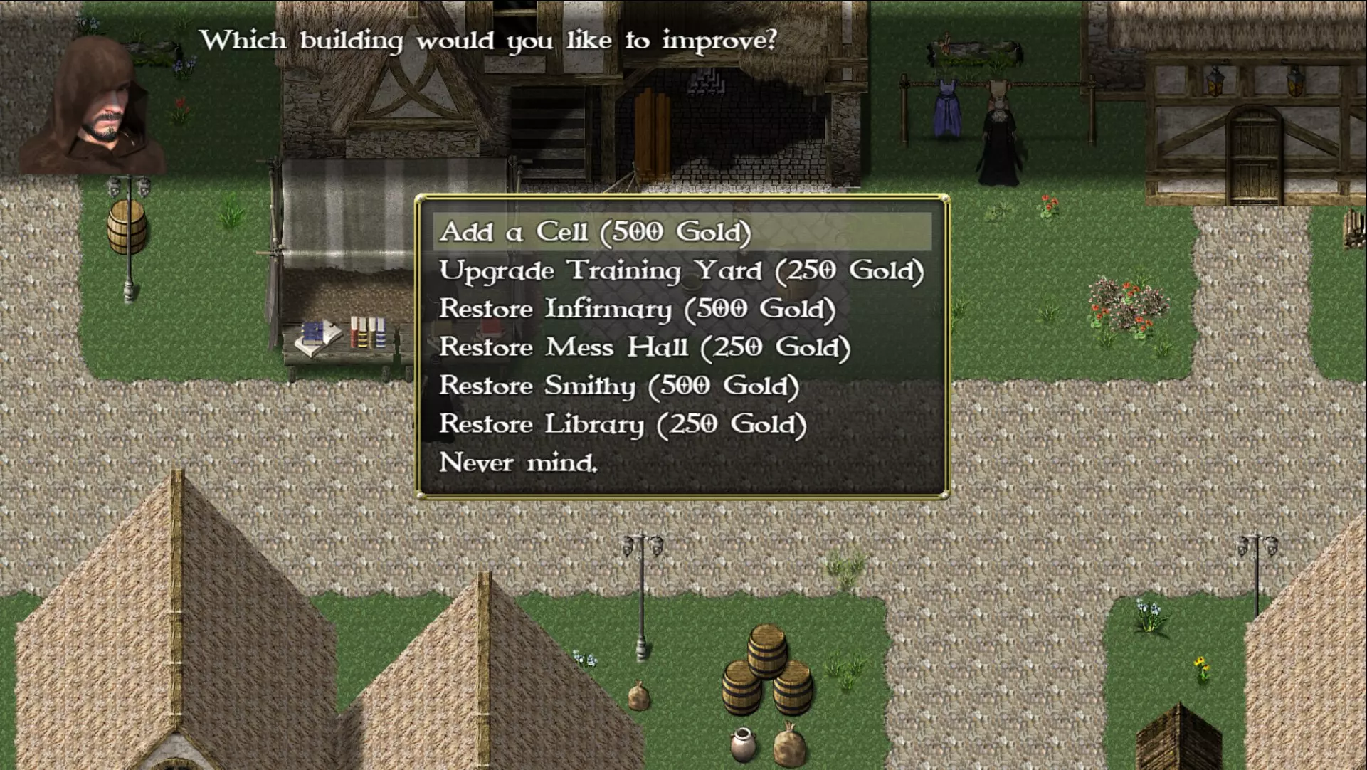 购买修复建筑后,你必须为其配备人员才能从中获得收益。游戏内会详细说明相关信息,内容本质上很基础,只需点击几下就能了解细节。例如:训练场需要训练师,图书馆需要抄写员,食堂需要厨师。这些都相当基础。雇佣人员需要额外一周时间,而且一旦雇佣,员工的周薪会增加你每周的成本。 确保你有足够的金币,不仅要覆盖修复费用,还要包括员工雇佣费用以及每周的成本。 铁匠铺 - 购买武器