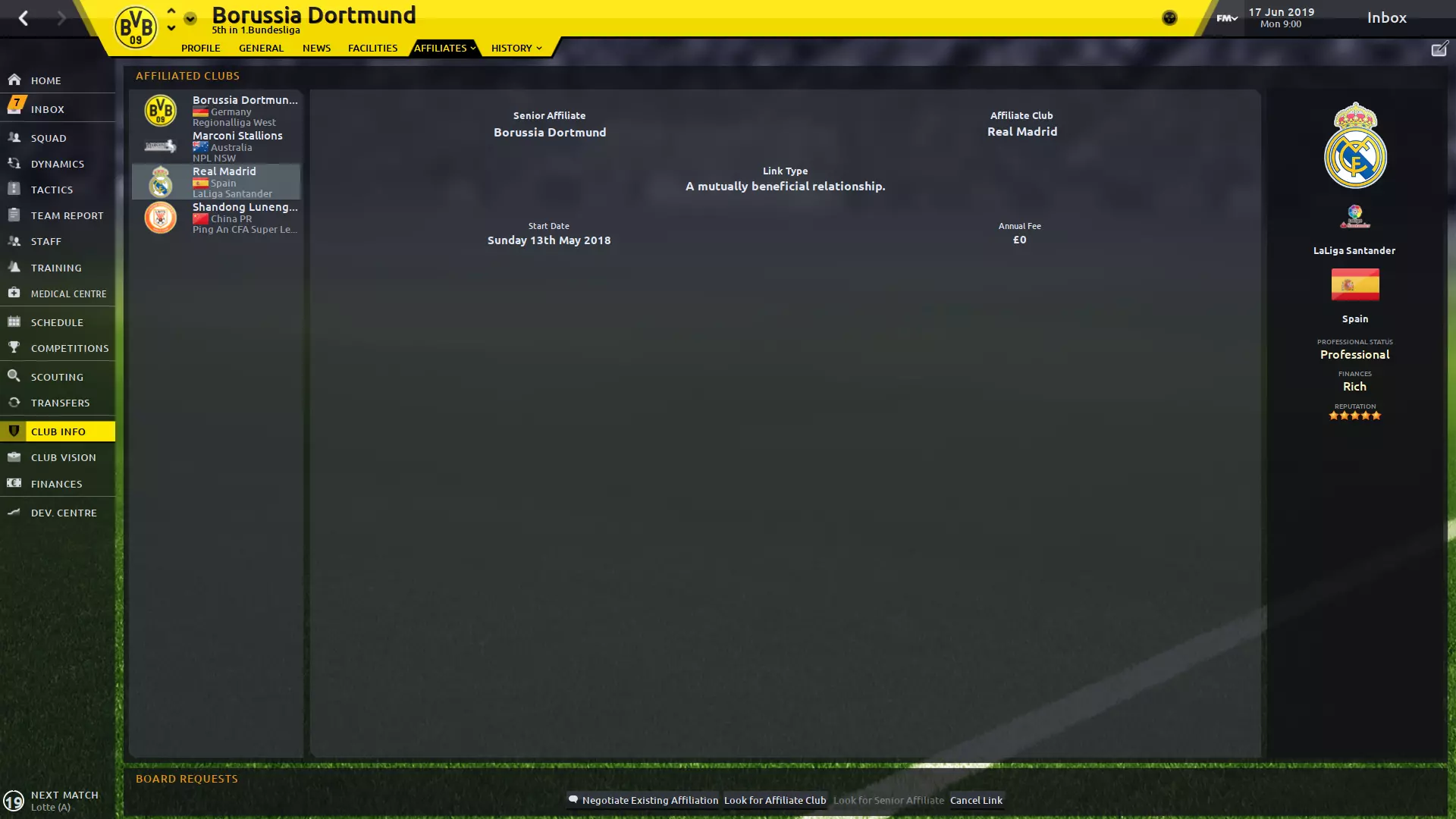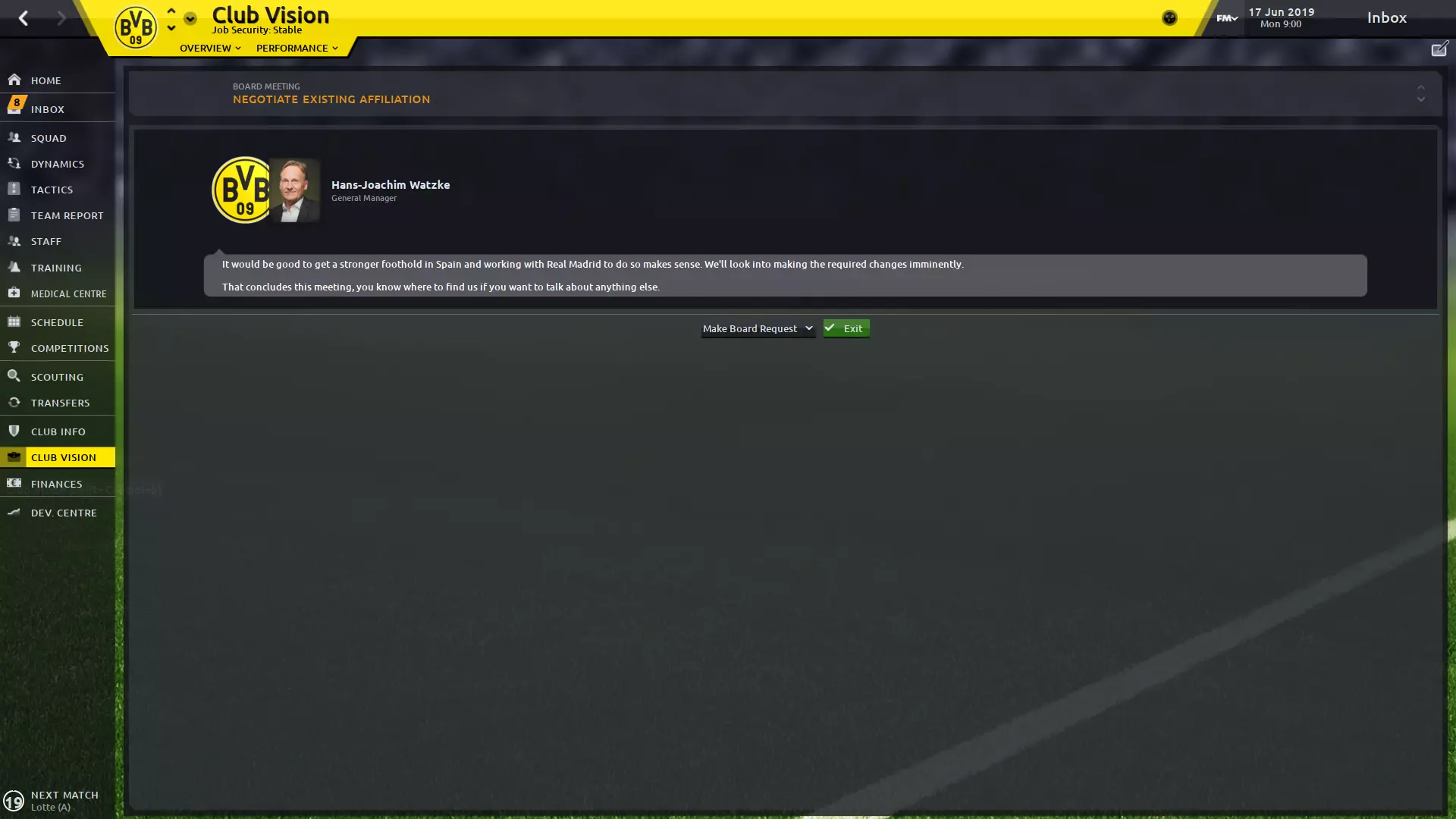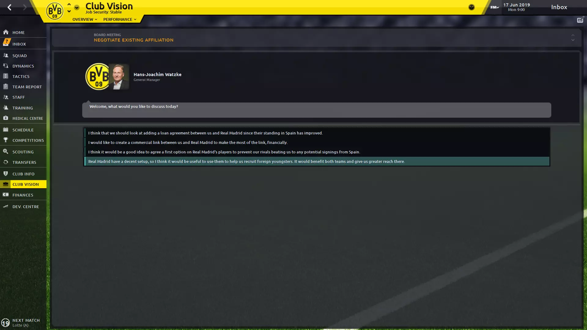 Introduction An attempt to collate a bunch of useful tips and explantions that help deal with the massive world of Football Manager. Development Arsene Wenger: "Young players need freedom of expression to devlop as creative players…they should be encouraged to try skills wihout fear of failure." Players age 24 and older are unlikely to dramatically improve their skills through training or natural growth. Players naturally develop their mental abilities through the experience of growing up with age. Goalkeepers typically have their peak between the ages of 31 and 35. Defenders typically have their peak between 27 and 32. Midfielders typically have their peak between 27 and 32. Strikers typically have their peak between 26 and 31. Physical attributes slowly and sometimes diminish at the end of player's career. Players with high versatility are less likely to lose new positions learned through retraining when they are not playing in that position. Players with a higher versatility will also perform better in new positions. During off-season, when you go on vacation or hardly train, your abilities will naturally decrease. Training is most important before the athlete turns 18. After that, game time is more important. Slightly expanding on training, if you're unsure how to do the schedules, the AI staff don't do a bad job at this part of FM, and you can always do invidual role training for the players to learn the role you use in your tactic(s). With this said if you choose to loan out players, you need to pick carefully when you loan them out to. Take into account the teams training facilities, the squad overall personality and their coaching staff. I generally look for either Excellent, Superb or State of the Art Facilities with a highly squad Professional personality. The personality of the players chosen to welcome the new recruits can also impact their personality. Head of Youth Development can affect the youth intake player's personalities. To have the u23s/u18s underneath the Dev Centre, you need to take control of either their individual or general training. Injuries Josh Altman: "If I could do it before, I can do it again." If a player is injured, it's very unlikely that offers will come in for them until they have recovered. Hamstring, knee ligament, and achilles tendon injuries can impede a player's ability and mobility, either short-term or permanently. Injuries affecting the spine or shoulder can hamper an athlete's agility in the short term or permanently. Severe or career-threatening injuries can hinder a player's bravery, but may come back later with time. You can also use the Injury Rehab focus that can help a players lost attributes due to injury recover. This will also revert once the player is back from their injury. The average team will suffer between 50 and 70 first-team injuries per season. This means that on average 25 players will suffer an average of 2.5 injuries per player. Man Management Arsene Wenger: If you put the wrong petrol in the car it's not going to go very far. For a human being it's exactly the same, you have to prepare the right way. If you tell a player in advance that you are resting him for a match, you can avoid concerning the player if he doesn't make the first 11/bench. With unhappy players, asking a team leader to speak to them often has a high chance of success to remove their concern. The longer they've been at the club and the team leader's age, the higher the chance of success. (Right click team leader > Speak About > Team-mate Happiness > Concern > Player) Furthermore if you're team is struggling for form, you can attempt to do a team meeting to raise morale. (Dynamics > Team Meeting) You will need to be mindful of the option you choose as it will depend on how your team is performing and what is expected of the club. For example if you've been doing well most of the season but hit a bad patch of form, the option "don't let your heads drop I know you have the ability" often raises morale. The safer approach is also to look for other ways to praise invidual players, such as those that have been doing well in training and getting a rating of 8 or more. Transfers Zlatan Ibrahimovic: "Zlatan doesn't do auditions." If you have a player that keeps refusing transfers from other clubs. Make sure you have put him on the transfer list, surplus to requirements and move him to the u23s/u18s. This will reduce the chances of them rejecting the transfer. Using installments to get players is very worthwhile as you can usually get at least double the amount of value out of that particular transfer window. Just be weary to not overdo and ruin your finances for the future. If your manager/club has a high reputation, constantly showing interest in a player can make them disgruntled and want to leave. This can often lead to them being added to the transfer list for a cheaper price. Stopping the board from selling your player(s): If a bid has already been accepted for a player that you want to keep, offer them out for nothing. Hopefully a higher prestige club will come in and the player would rather go to them. You will then be able to cancel the transfer. This only works if the player chose a different club than to which the board accepted the offer from. If no bid has been placed yet, offer the player out for nothing but then set the director to reject all offers.Both of these methods will more than likely concern the player in question. December 30th you can start offering players a contract for your club if their's expires for a different club that season. Some exceptions being if you are in the English Premier League, you won't be able to offer a player's whose also in the English Premier League a contract. Also worth nothing their wage demands can differ largely from December 30th/31st to Jan 1st. Real Madrid - Feeder Club Yeap you read that right. If you start with Borussia Dortmund you can negotiate the existing affiliation and state it would be useful