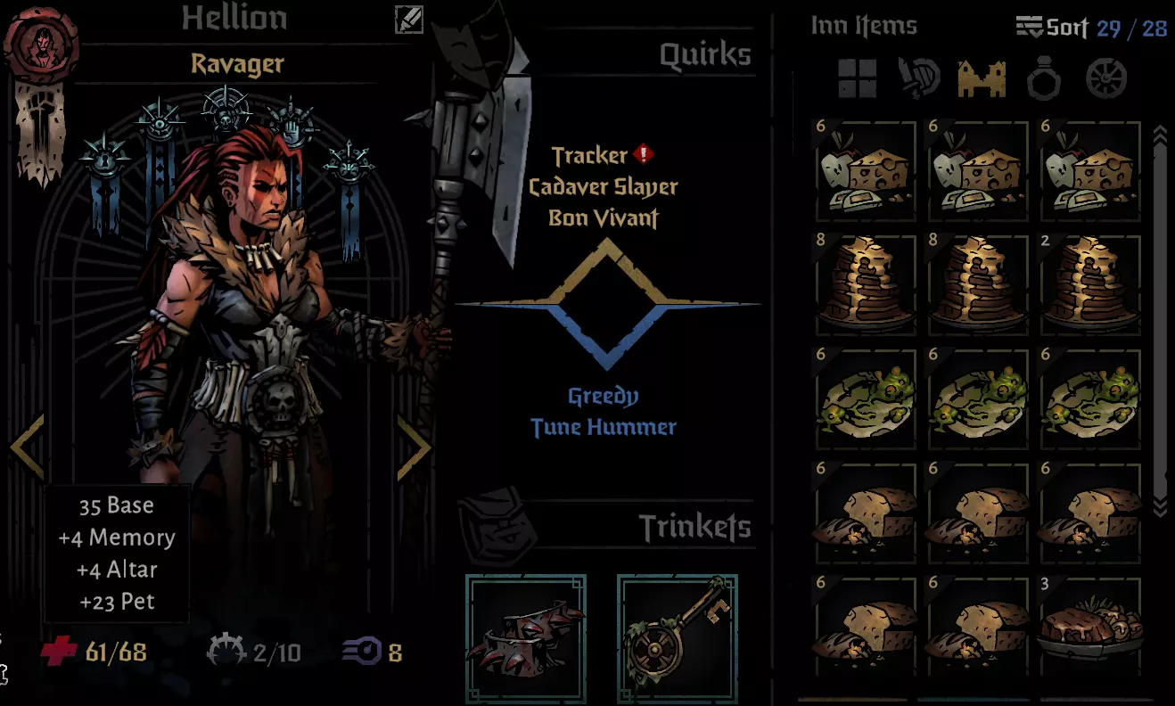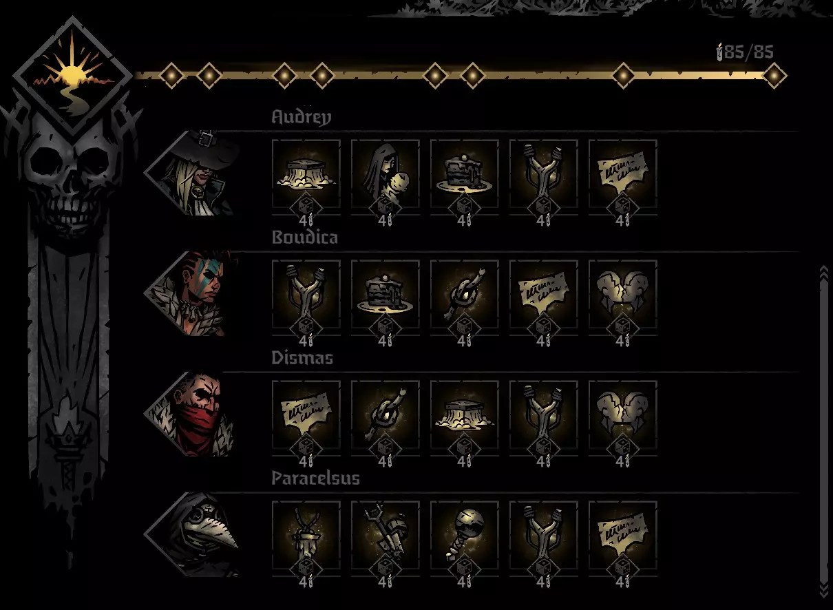 Take Aim: Can be a nice early-run damage, but becomes redundant later as crit chance increases naturally through trinkets. Often not worth the turn investment, combine with combat items that give strength for maximum dmg. Strategy Notes Big damage to the backline when hitting both enemies. Big damage on whoever is left Apply combo tokens with Double Tap right before Hellion acts Steal enemy tokens when needed General strategies and game mechanics Nodes We love to fight. We want to fight. Fighting enemies is our main source of relics, baubles, and mastery points. We use those to buy items, trinkets, upgrade skills, and manage relationships. We want as much combat as possible. That means Lairs, Resistance Encounters, Oblivion’s Ingress, Creature Dens, and Road Combat. These should be taken whenever reasonably possible. Road combat deserves special mention. It has a chance to reward relics, baubles, and mastery points, but more importantly, it is the only way to encounter the Toll Collector (5% to spawn if a trophy is equipped). Actively farming this encounter when possible is highly recommended, as it drops Dismas’ Head, one of the strongest damage trinkets in the game and a perfect fit for this team. The drop is not guaranteed (only 1 out of 3 heads), but the boss can be encountered multiple times in an act, though only once per region. This makes it possible to plan road maps to maximize the chances of generating the boss. Even beyond the Toll Collector, road battles are the best road events, as they are the only events that provide positive outcomes in the form of relics, baubles and sometimes mastery points. If the Mountain is reached with around 10 mastery points remaining after upgrading all five skills for every hero, that is a good sign. This tends to happen frequently when combat is prioritized. Actively look for hoarders when holding plenty of baubles (usually later in the region). there are plenty of Trinkets we want to have. imagine the hoarder is like reaching an Inn in the sense that it gives you another reroll for items you can buy. I like to enable the option to sell to hoarders, so keep items in your inventory that you can sell for extra relics and baubles. The “0 protection” approach: baubles can be preserved by avoiding stagecoach repairs and accepting the occasional repair battles instead. This can be useful when the focus is purely on resource accumulation. Personally, i just like to repair and avoid the hassle, the repair battle is affectively a 3 on 4 enemies with uncertainty around which hero is affected. Repairing normally and benefiting from buffs tends to be the more stable option. Movement This team does not like to move. Skill positioning becomes an issue very quickly, and even Toe to Toe can only really be used safely when Hellion is in position 2. Otherwise, there is a real risk of locking the party into awkward formations. Early on, bosses such as the Shambler and especially the Harvest Child should be avoided. They represent unnecessary risks for this setup. For that reason, one of the best items for this group is The General’s Dream (One of the trophies rewarded by killing the Lair boss in the tangle, the General). Locking the party in place for the first five turns of each fight is extremely valuable for this team. Value Darkest Dungeon 2 is a game with a lot of RNG, becoming a better player means squeezing out consistent advantages, in the following sections I'll cover some of the more significant methods to improve chances of success Combat Extracting value from combat is very important. Topping up the group’s health and removing as much stress as possible is key. The Hellion’s final blow 25% heal should be used to its maximum potential, and Raucous Revelry should be used to reduce stress when it rises above 5. Fights can be delayed when extra turns are needed to squeeze in these effects. Allowing an enemy to attack again into Audrey’s Repartee will often result in a dodge and grant an extra round of actions. This may not work perfectly every time, but over the long run, managing these small advantages makes a significant difference. Keeping the party healthy and stress free using these tactics is essential. Party stress can also be managed by deliberately maximizing critical hit chances during combat. Crit is a core part of this group’s style. Critical hits have a 50% chance to reduce stress on the acting character and a 10% chance to reduce stress on every other party member. More crits directly translate into more stress relief across the team. Skills that hit multiple enemies, attack twice, deal no damage but can still crit, or naturally have higher crit chances should be prioritized whenever possible to increase the likelihood of crits. This ties directly into relationship management through consecutive actions, which is covered in the relationship section. The Road The road has its own relationship mechanics. While traveling, the party generates random relationship events that take quirks, both good and bad, into account, along with current stress levels. Stress breakpoint: 3 3 and below: positive relationship events are more likely 4 and above: negative events become more likely Keeping characters at 3 stress or less whenever possible maximizes positive relationship outcomes. The Hellion can only reduce stress to 4, so items such as Mineral Rich Spring Water (-3 stress and heal 5hp), Laudanum (-1 stress and clear Terror), and other stress relief tools are required to push stress down to 3 or below. A relaxed party is a happy party, which in turn helps keep stress low and improve relationships. Other road mechanics to keep in mind: Healing occurs while traveling and can be used strategically between nodes. In trash fights, healing should generally be avoided unless a character is close to Death’s Door or has a DOT that would push them there. In most cases, allowing the free road healing to restore HP is more efficient than spen