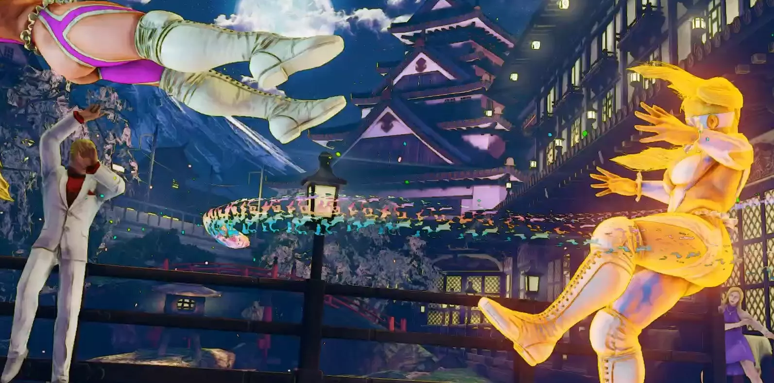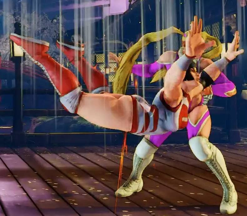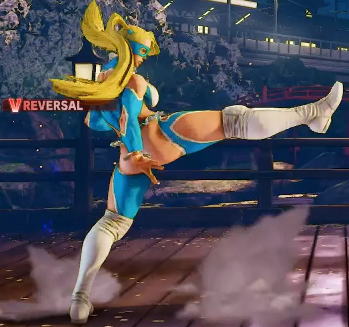 按住中拳+中脚,米卡会拿出麦克风开始独白。按住的时间越长,她所有投掷相关招式的强化效果就越强。在此期间,她还会获得V技能计量条,并且在施展此动作时拥有一次护甲效果。该护甲可以吸收一次攻击(但无法吸收多段攻击或投掷)。 刚开始施展这个动作时,她处于1级状态,这会为她所有投掷(普通投掷以及包括“无翼飞机”和她的超必杀技在内的所有指令投掷)提供小幅伤害和眩晕加成。米卡说话的时间越长,周围会周期性地冒出烟圈,表示等级提升。总共有5个等级,在最高的5级时,任何投掷都能一击必杀。一旦你松开MP+MK按键,米卡会立刻停止说话并将麦克风扔到地上,麦克风会在她面前轻微向前弹跳一下然后消失。这实际上被视为米卡唯一的投射物,并且确实会造成少量伤害(通过这种方式可以获得Mic kills)。 你可以用这个技能来抵消敌方投射物、设置一个延迟生效的麦克风投射物,或者潜在地引诱对手前来攻击,希望能为你创造一个施展强化投掷的机会。 遗憾的是,如果你在获得强化后受到任何攻击,或者投掷尝试失败(包括普通投掷),强化效果就会消失。 这是一个相当有趣的招式,因为你相当于在暗示自己接下来想要施展投掷,这可能会让对手在心理上有所准备。另一方面,美华的独白时间越长,你获得的V槽就越多,这有助于你更频繁地使用V触发和V反击。通常在实际对战中,尤其是在释放彩虹旋风(qcb + p)后,你最多能积攒到1级或2级V槽就需要停止独白。 抚子(V触发)hp + hk