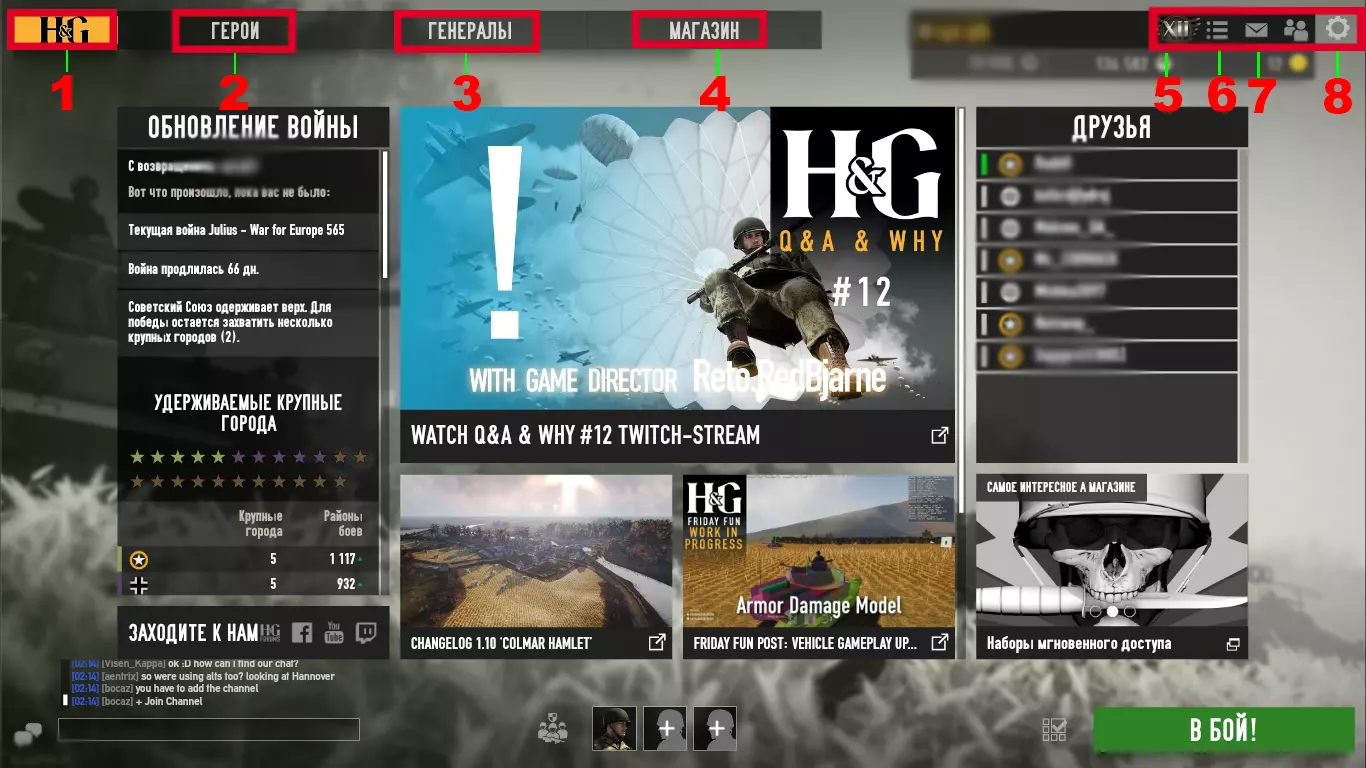 在本指南中,我会为新玩家简单介绍一下游戏,提供一些关于游戏行为、武器改进、资源获取等方面的建议。 希望这份指南能对某些人有所帮助,因为游戏里的新手实在太多了! 简介 需要指出的是,《英雄与将军》以前是一款浏览器游戏,我几乎从它刚出现时就开始玩了。我想说的是,这些年来游戏发生了很多变化,而且直到现在还在不断更新和完善。开发者们还没有放弃这款游戏! 本指南将包含以下章节: 游戏介绍(游戏职业、界面等) 战斗技巧(如何游玩射击以及最好不要做什么) 装备与资源(如何刷取和更好地强化武器、维修费用等) 个性化配装(武器的各种改装方案) 从何开始?(如何升级,升级什么比较好等等) 让自己在战斗中发挥最大效能 -> 步兵(装备、士兵、小队,适用于已掌握射击技巧的玩家) 本指南既适合新手,也适合部分有经验的玩家,祝您阅读愉快! 【注意】本指南中可能存在拼写和标点错误,因为我是在游戏崩溃后制作的本指南,当时已是深夜,而且我制作指南的经验也不多,所以希望大家能直接指出问题,不要开玩笑,有问题的话请在评论区告诉我! 本指南会持续补充,关于补充内容的建议也请大家在评论区留言! 游戏介绍 界面 我先对界面进行简要介绍: