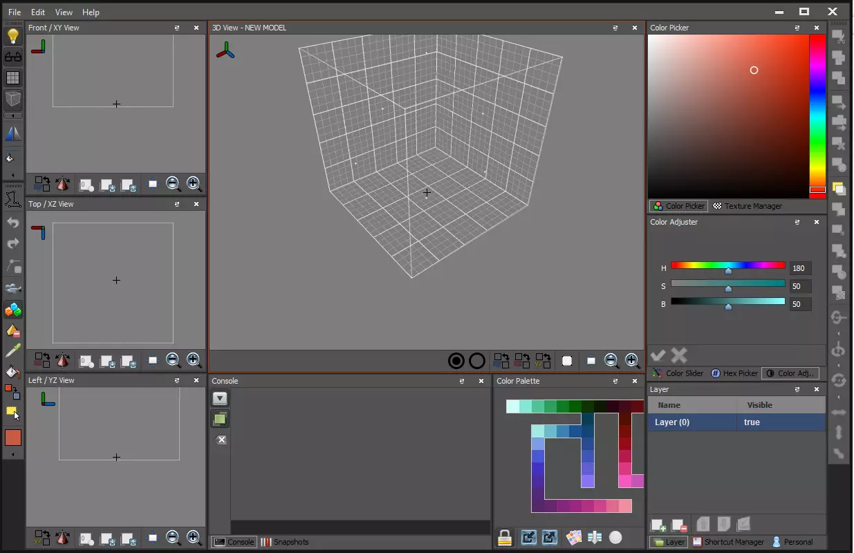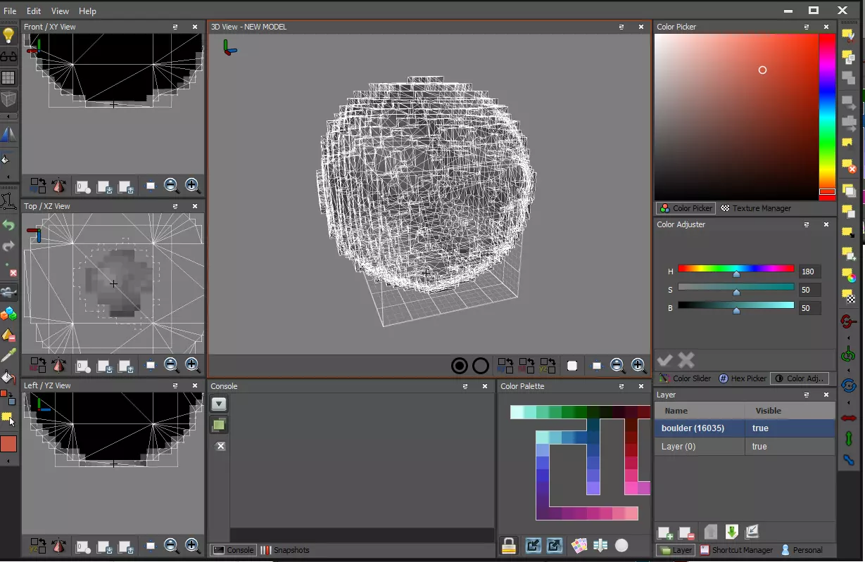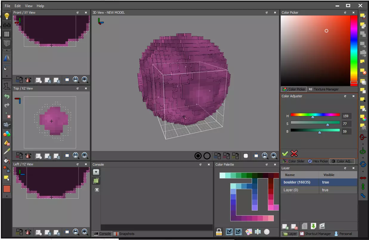 当所有体素都被选中后,你可以使用界面右侧的颜色调整器工具箱一次性为它们重新着色。调整这些滑块,直到获得你喜欢的颜色。我喜欢粉色。