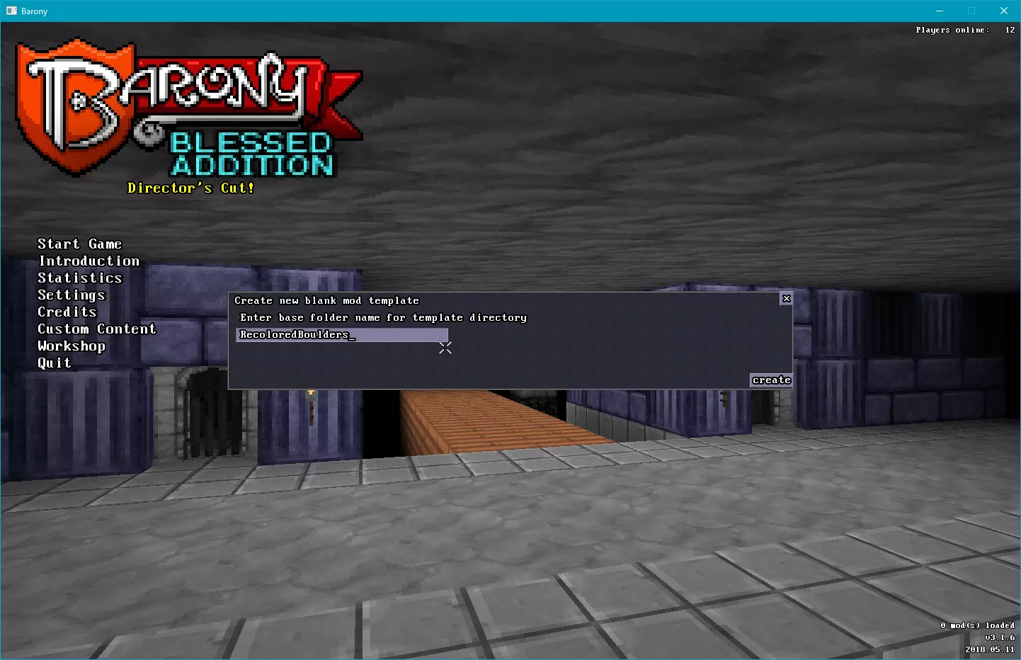 系统会提示你输入一个模组文件夹名称,由于我们要对一些巨石进行重新着色,我选择了“RecoloredBoulders”。输入完成后点击创建,你将在《Barony》的mods/文件夹内看到一个新目录。