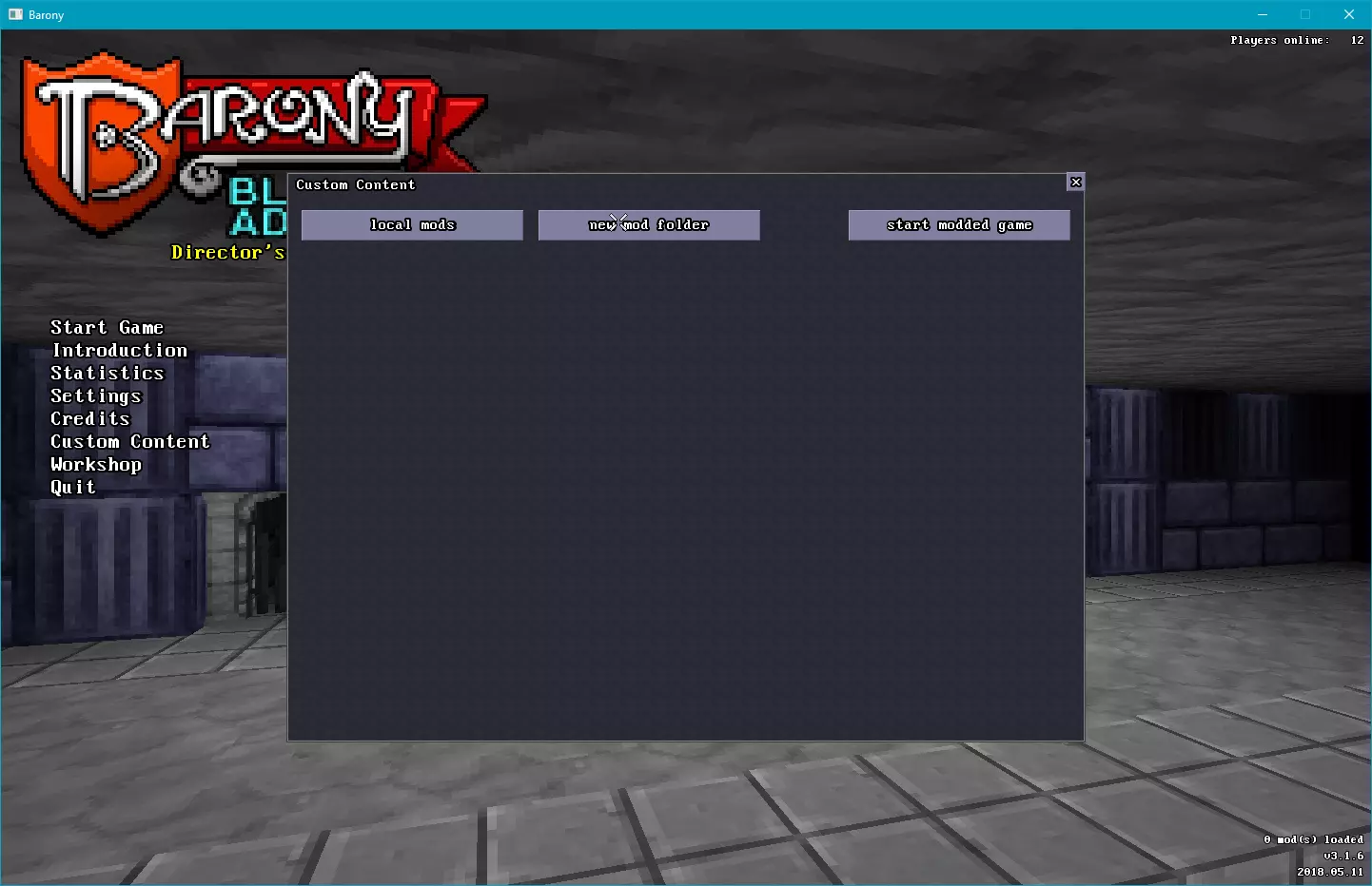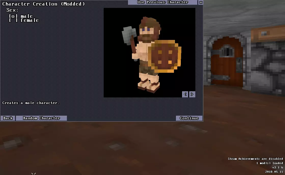 现在点击“开始模组游戏”以在《巴罗尼》中加载文件(加载过程中你会看到屏幕短暂闪烁黑屏)。重新加载单个模型不会花费太长时间,但如果有大量已更改的模型文件需要加载,可能需要几秒钟。请注意,仅加载包含已编辑模型的模组不会影响你的Steam成就。 唯一会禁用Steam成就的情况是模组/RecoloredBoulders/maps/目录中存在内容,正如我之前提到的,在你首次创建文件夹时应该删除levels.txt文件!因此,如果你在角色选择窗口的右下角看到Steam成就已禁用的警告,请检查你的模组内的maps/文件夹是否为空。如果禁用,它会显示为这样: