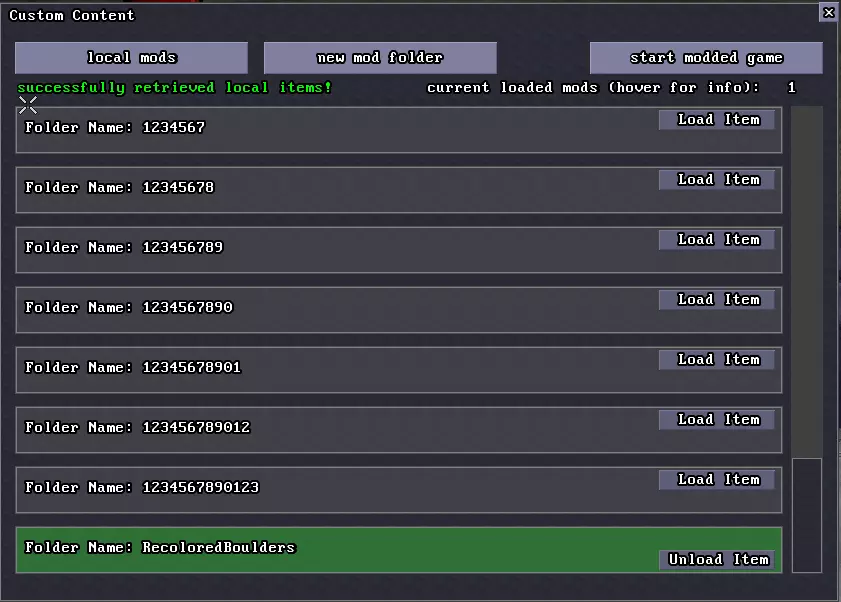 如果你想给它取别的名字,需要将models.txt复制到你的mod/models/文件夹中,并在复制的文件内将名称修改为你想要的名称。(例如,我们可以将其命名为boulderPink.vox,并在models.txt文件的第246行进行相应修改。) 不建议编辑models.txt文件,因为当加载两个或更多修改models.txt文件的mod文件时,会产生冲突。因此,如果你想用描述性的文件名来命名导出的模型,建议在电脑的其他位置新建一个目录,用于存放所有VoxelShop项目文件。你可以手动从该目录复制粘贴到Steam目录,这种工作流程比直接从VoxelShop导出更好。随着你体素艺术技能的提升和不断尝试最佳方案,你可以将修改版本命名为boulderV1、boulderV2等,准备好在游戏中测试时,再将它们最终重命名为Steam目录中正确的boulder.vox文件名。 是时候在游戏中加载这个模型了! 在游戏中加载模型 到这里,艰巨的工作已经完成。剩下要做的就是从自定义内容窗口中选择你要加载的本地模组文件夹。点击该窗口内的【本地模组】,查找Steam目录中的所有模组文件夹,然后点击【加载项目】来准备加载文件。