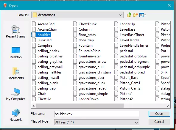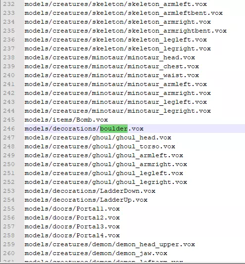游戏会在该文件中专门查找第246行,以确定游戏内模型使用哪个文件。因此,查看decorations文件夹,我们可以找到需要编辑的boulder.vox模型。