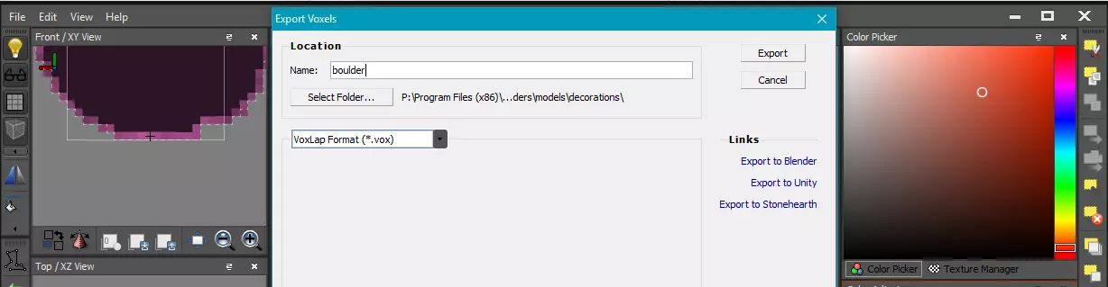 完成所选体素的编辑后,按ESC键取消所有体素的选择,即可在不显示网格线的情况下查看模型。现在需要将其导出到mods/models/decorations文件夹。再次打开文件菜单,点击【导出...】按钮或使用快捷键CTRL+SHIFT+E打开导出对话框。 导航至Steam mods目录,路径为C: Program Files (x86) Steam steamapps common Barony mods RecoloredBoulders models decorations,这是我们保存修改后文件的位置。该位置必须与游戏通常期望模型文件所在的路径一致(models/decorations/)。