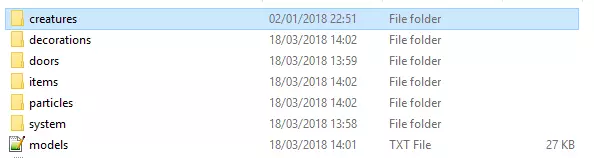 现在我们要找出《Barony》中巨石模型文件的位置。回到基础目录,进入models文件夹。你会在creatures文件夹中找到怪物肢体模型,在doors文件夹中找到门和传送门,在items文件夹中找到游戏内物品模型,在particles文件夹中找到粒子/魔法效果,而其余的杂项游戏模型,如家具、巨石、喷泉、箱子等,则位于decorations文件夹中。
