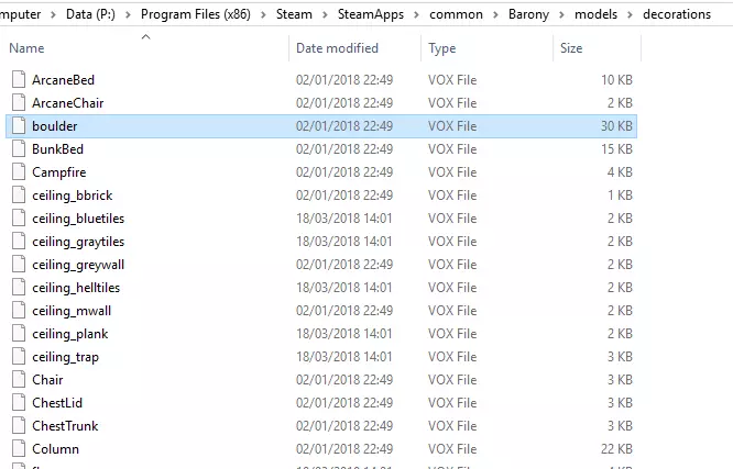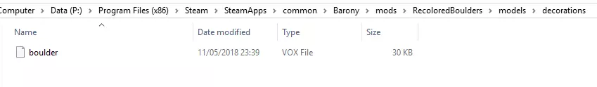 从下拉框中选择【VoxLap格式(*.vox)】,这是《Barony》接受的正确模型格式。选择其他格式可能无法正常运行,或在加载时导致游戏崩溃,因此请确保选择正确!保持模型名称与原始名称一致(boulder.vox),因为这是我们之前查看的models.txt文件中指定的文件名。 现在查看mod文件夹,应该能看到导出的boulder.vox文件,如下所示。