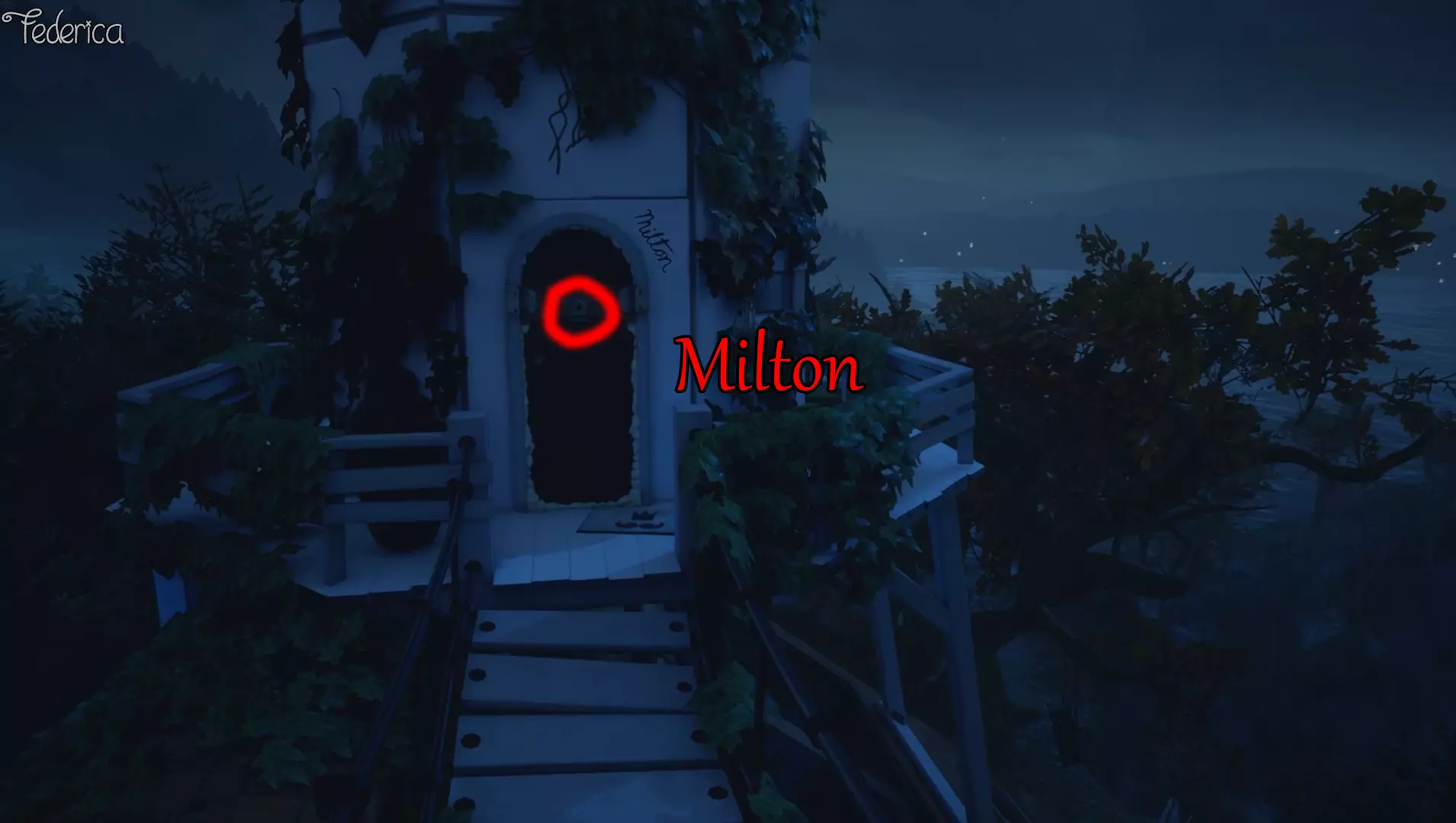 8) 对成就【MILTON】有帮助 爬上房子顶部后,穿过小教室,你会找到米尔顿的门,查看门上的窥视孔来听取伊迪丝的评论。