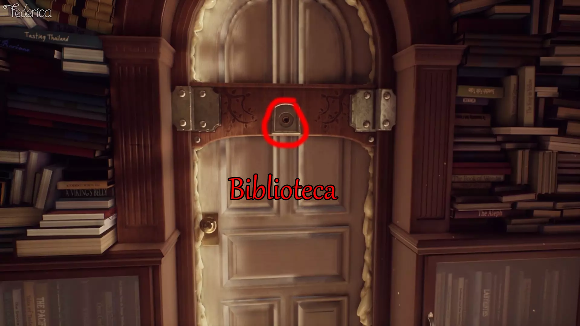 1) 对成就【BIBLIOTECA】有帮助 在一楼,我们可以找到图书馆的门,查看门上的窥视孔来听取伊迪丝的评论。