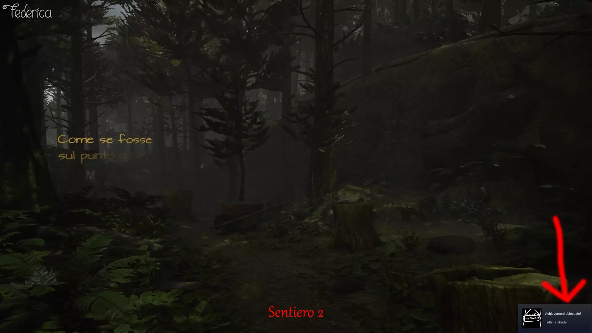 【达成条件】探索两条通往芬奇家的小路 这是游戏中可以获得的第一个成就。 芬奇家有两条小路,由写着“THE FINCHES”的路牌明确分隔。要获得该成就,你需要探索两条小路,并聆听伊迪丝在途中的所有评论。 具体步骤:先探索第一条小路(建议从右侧开始),走到两条小路汇合的地方后,沿原路返回至“THE FINCHES”路牌处,然后探索左侧小路直至终点,即可解锁该成就。