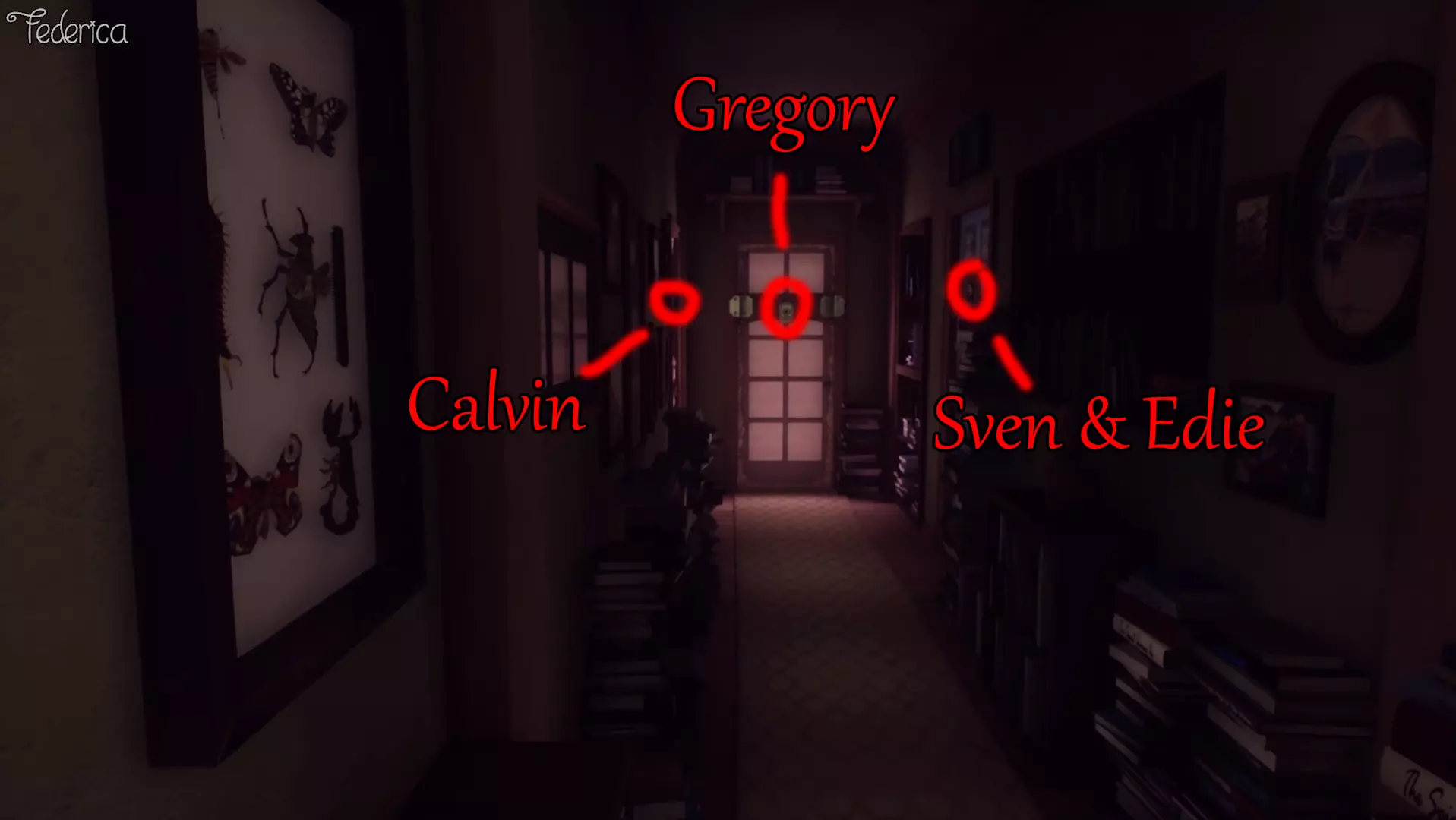 3) 4) e 5) 对成就【CALVIN】【GREGORY】【SVEN & EDIE】有用 在最前面,我们可以找到属于CALVIN、GREGORY以及SVEN & EDIE的3扇门,检查各自的窥视孔来听Edie的评论。
