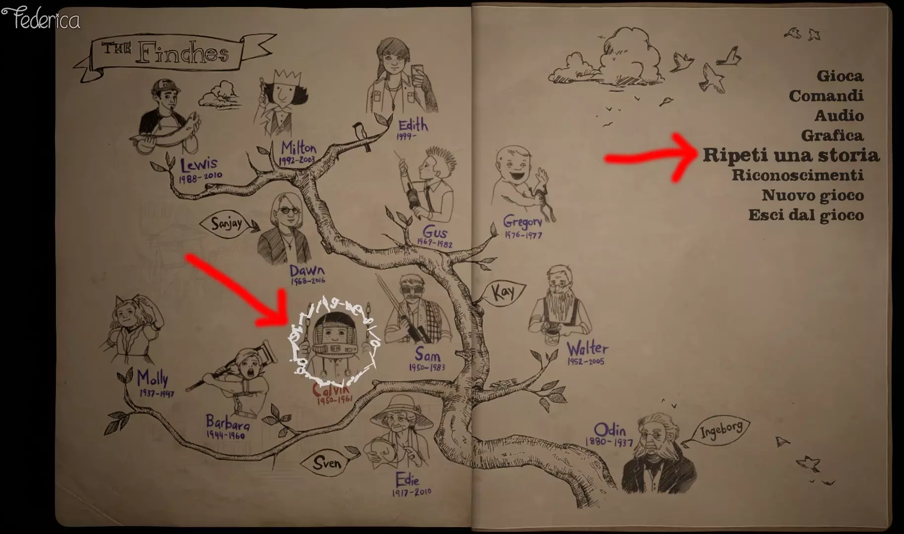 完成所有故事 完成芬奇家族所有成员的故事(按出场顺序):莫莉 - 奥丁 - 卡尔维 - 芭芭拉 - 沃尔特 - 山姆 - 格雷戈里 - 格斯 - 米尔顿 - 刘易斯 - 伊迪 - 道恩 - 伊迪丝。 该成就会在片尾字幕开始时解锁。