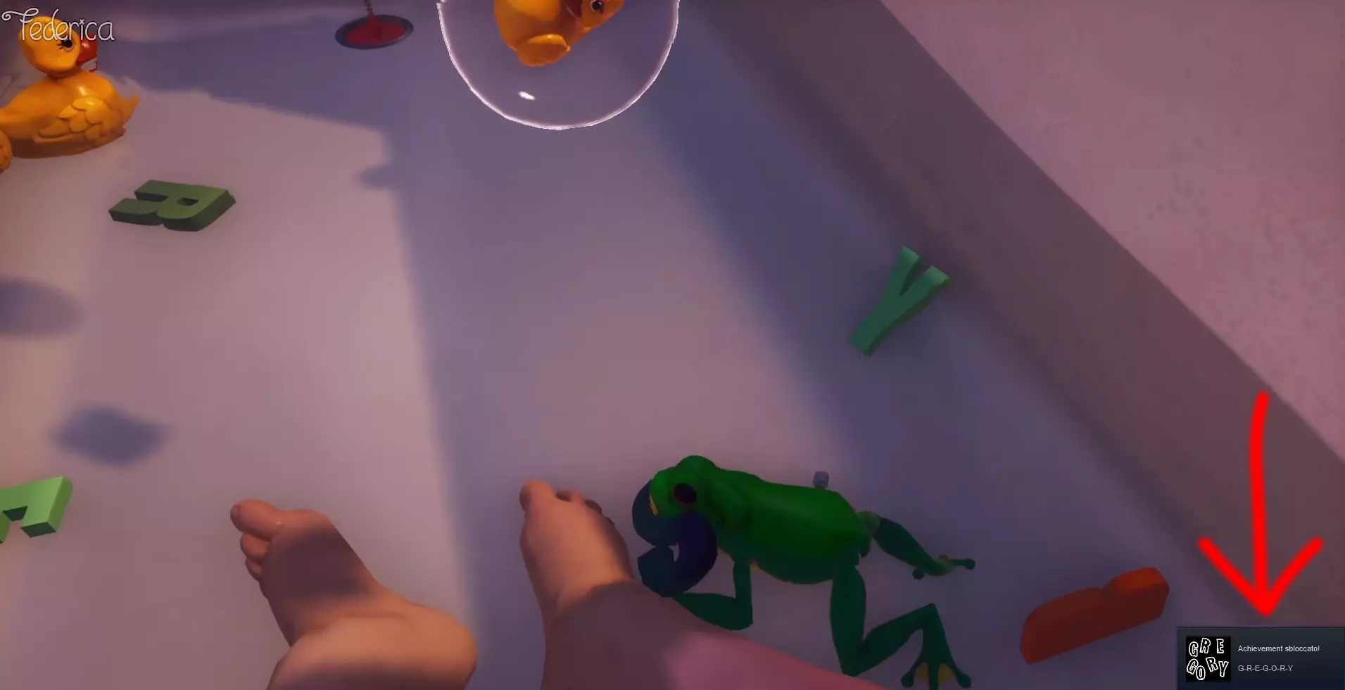 在格雷戈里的故事中,我们的目标是将右侧所有组成“Gregory”名字的字母扔进浴缸里。我们需要使用绿色青蛙,只需朝着字母跳跃就能让它们掉落。按住跳跃键的时间越长,松开按键时青蛙跳得就越高。慢慢来,执行这个操作没有时间限制,但要注意不要碰到蓝色鲸鱼,否则故事将继续,你将无法再让字母掉落。