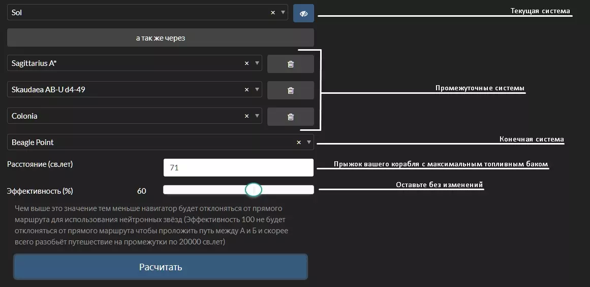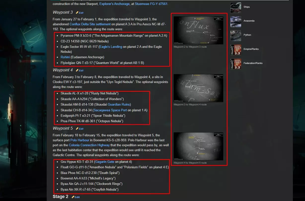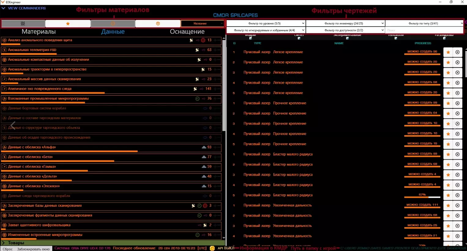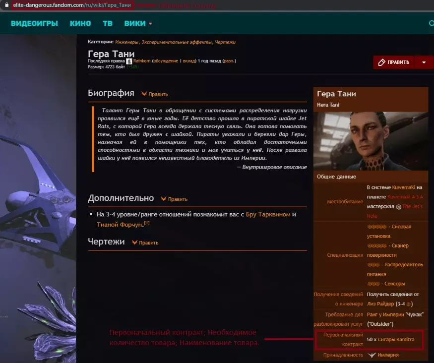 33. Дополнительные сайты и программы, которые будут вам полезны EDDBhttps://eddb.io/ Сайт выполняет функции по поиску систем, станций, товаров и маршрутов. Полезен для всех родов занятий. Не раз упоминался в моем руководстве ранее. INARA https://inara.cz/ Сайт выполняет функции по игре. В нем вы сможете осуществить поиск товаров, мест их продажи и покупки, станций, систем, зон конфликтов, информации по инженерам, статистики, текущего положения игры, форумов и многого другого. Будет полезен всем. Spanshspansh.co.uk/ Сайт по составлению маршрутов. В его функционал входит одна из самых полезных вещей для исследователя - neutron plotter А также планировщики маршрутов для торговцев товарами и данными, пассажироперевозчиков. EDSMhttps://www.edsm.net/ru Сайт предоставляет возможности для нахождения интересных мест, записей кодекса, систем (с описанием, которое очень полезно исследователям) и просмотра экспедиций с их участниками, точками маршрута и датами. Сайт будет полезен исследователям. E.D.I.S.O.N (Elite Dangerous Improved Surface and Orbital Navigator)https://www.dropbox.com/sh/o8bzpp8zwyy4029/AADUCZ1n__27EzQLXNscK4B1a?dl=0 Программа для приземления на поверхность планеты по точным координатам. Fuel Rats https://fuelrats.com/ Что делать, если у вас закончилось топливо? Обращайтесь к топливным крысам. 34. Не поместившиеся ссылки Не поместившиеся ссылкиОбещанная ссылка со сравнением кораблей (пункт - "фит исследовательского корабля") https://coriolis.io/comparison?code=N4IgdiBcIKIB4AcA2B7ATgQwC4EsUQBoQAjKAbVAGcoQMwMBjfAEwxCImgEF6mxWABAFoBAZnYgGNLgAYEMrMwBiAayT9RlOADMALEIBMATiGmzMg2auiAFttEBGAJ7OlDowEcHAeSG7RAG4AbDJgBjgGugB0XADuAEoAVgDsAKreYADSSDgAtjBcALyFMbEOABwAWgAaBVEAErqUAJJcbe3tBgAKunDlyXFdAMLVSqk2sckGSjgAmt4AQli6AOJKAOYwzbFclCjxBgwAIgCysR71cDaVK0e6AF4A9Ild9R4Ays0rqYnlHgCKDHe9XqAFMuEEAkgAGraAKiR4AGSCxAWC0q8TAAGocAwFipcgwYE54schvEVojHtTHjgnCguA53pRiI82k5ctojAApWLve4AVlS5QKDn%2BKAM1SCFKQzSUCy4uQAKgxtALKo8bIkFkpHgtoQF1l1uWBkusVg5KMF7usbAFmFwcP9dIjYkdmE4sdUuHBKEN1qDvNVtNSjJlmltofFMokAHJcDBoLFPWYBLjMADq%2FzijyxjyMoPuWP%2BGFSugCsWqCwQsZwQ0eYBkjyemoWDqx8SwCICXveXXWXCQCz0CF0xCU2mQj3KSBsMAnyQFm3elX%2BmV0HgWMCQ3LZK0qRm01Ue2jgK3%2BGZk8QWuneeKwSGqAuqTjgJwCAqGXG8628RwwswMLEMiZNS%2B7tEoszJCc%2Fy5EcXDZlwIAAL4EFQNAYJQCASJwsCIKgaCgmgEhSNwcgKMo2g5MwmhgHoVimBYZiiAwPgyA4Mg4P4wSeOEpRJA8saVBgRQlHEFSgv8xQNE0rQdB03S9P0gwjGMvy5P8%2FwqAArl0QEnEqRyxLGaaxCcXA2CsXBKEgQzeGaNxKO8WInEc2yPCs2hVLERjvE4%2FxwO8WblCo3jeLoXCxtoKxoI8XSxdUMhOEcQxOC8RgwOUQzcic5TNCoODlEcMA4M0GY0o8bipFwHhIAwBhYtZKjvliSrrFgWCpLE%2FxHNCQyJJUk4wKW6ypDAQyVLGcCPOoWIrCcMDVOUSgZo15SctpXDEBmTiPGg3hDBgBgyFuCCxEoujrGZ3oYEM8FOOGMDeKk%2FzNP8Hg4EoRyJMWzCpPcASpumWY5nmBZFiWZYBNpYA2JQ0LlJQS1YgwmTlNCzQIPcBhBFyjwqGu6zrBgzRYP8%2BLcokThGIOlRUrMuT1EENj%2FEqqQrPENgnOF7wLGgATJF0bQMBZqRDBmmTQlwCptIUKFoSA1DQMwOAYLkLDEIwKgAPqgvh6BEThNDwMgBvEUQpEgLI8iKBOSDMDRlDMPRjGWKYogGA4PSiJx7E8R4fFxEkQrNA4srSeJ5TvFJJSNC08kKT0fQDLEwyjD862aTpelmYZxmmeZlnWbZ9nrI5zmue5nneb5%2FmBcFoXhZF0WxfFjyJclqXpZl2W5flhXFaV5U0lVNV1Q1TUtW1HVdT1fUDUNI1jRNU0zdi82Lctq1cOt2ibdtu37Ydx2nedl3XQmd1cA9EbPa972fd9v3%2FYDaaZtmsS5vmhbFqW5ZBLDeG5RKzlBRmjDGWMcZ4wJpkImJMyYUypjTJAGZ6aM2ZqzdmnNua3j5gLIWXARbrGhDgUQ3IpYyyKPLdC0AVCYBwFgbWCAbB0CwCgXIRtoAmwIobC20hyK2yojgR2lAXau2Ygwding2JcUCEEcIkR%2BKJF0C4FYGZmgRzKOULM0k45yQTlwRSycVLp3UlnXS%2Bk84mTiIXKyNk7IOTWBXNyn9q6VB8n5AKQV%2FghTChFKKMU4oJSSilNKXQMpZRynlAqRUSplQqqPWq9VGqqCnu1Tq3Ver9UGggYaqRRrjUmtNWaG8lorTWhtLaO09oHSOidGAZ0LpXRODdK%2BN8novTeh9L6P1%2Fh%2FQBkDd%2BoNv4Qz%2FgEXIgCEYyGRqjdGmNsa4yMPjQmxNSbkxUJTamg5QRoKZizNmHMuY8zwYLYWuwPCgiQHABw0t2hy2QgAXSINocgyQCACgILoAgDgCCiCeSAbC0B6C5FBBIZgUAZDISAA Сборки антитаргоидских кораблейType-10 https://coriolis.io/outfit/type_10_defender?code=A2putpFplkdusif60u0v0H0H0H0Hx80p0p0404040404Sn0202B75sfm2C2R2b0i1Z2G2dm91V.Iw18ZXEA.Aw18ZXEA.H4sIAAAAAAAAA41Su04CURCd5f1QFpblGZQVFjEWBjsLE2002hBKEis7Y2WhiQUFhTHWFlYUlv4BFsbKj7CwsDJ%2BADFE4Y5zNuEWRuNucTK758yZxw6pKBFNwwKTa4HkQ4Bovj9HlOlKZN0nidyRQcSG2tLKnkDsKU5kbn4w529N4QMqDz4I%2FlTA7E2Y7VeB3EqCqOgIU%2FeUQVXWTudQup%2FMXiW7lxPlizAcUuszO3NvJPzgjZnDakOn9gXiR2mixHjMbCJ%2FCa81vDYQLSPiiDpETkjA2q4SraHn0klBisRUV%2Fe8IBC%2ByhJFMFj9Qj5y%2FB%2FeVAeat9Gp05YisC5g0noL9dN%2BRBm1owcbQIQlWK0zWQfKVZ9TUs7yI8r6Edl%2BRDk%2FooJqzKYjbMdKN4kqiLj4N1VSbW19DGtsItP5Yna9H1NW%2B%2BAN8JcCxru4RO%2BmzE0co1OUs%2BJFtapNbnC7jxKmnIo4IbLg6SLiqgrqY%2BrsSv9ekdrP%2FKHOH%2Bp8RMz0%2B%2FMNU4Wgfj4DAAA%3D.EweloBhA2AWEoFMCGBzANokICMF8KERA&bn=%D0%91%D0%BE%D0%B5%D0%B2%D0%BE%D0%B9%20Type10%20ANTITARG Federal corvette https://coriolis.io/outfit/federal_corvette?code=A2putpFklkdzsxf50H0H0vx8x8yLyL04040404xsSn0202B05sfh2d1O2C2L2d2d320n2H1V.Iw18ZVA%3D.Aw18ZVA%3D.H4sIAAAAAAAAA42SPUvDUBSGT9Imtak2HzQ1Fm2jjVYcRDcFwS6Cgk4urm7irOBQpA7%2BAQenDh0d3XTo6I9wEHESF7ciRdp7fE%2Bhd3BKhpdzeZ%2Fzce8JqRwRjSzI8A5S6JlEM%2B1pIv8EUfBcIEr6BhEbaleT15CplzyRu%2FPDXO668E1VFj8j%2FgXEbQ2ZSx%2BQcNUhimI49TGZURVd6UrI5Jd53KnUCkG%2BweGs2pyUc%2Ff78DufzGypLZ16A8mfeUTOYMDsSv6iHJfkuCzRikRsq9NJTuA1iNal3NzhApo46ljPXIVYTZvIljtFXUi9%2BY18V%2B3pnh0ZR%2BYLNi4xqTxB7bWISl4ayE8DBWmgWXWkoXOIGeGd7ccsFriN2%2FjvkFDIpIf9cqQOB