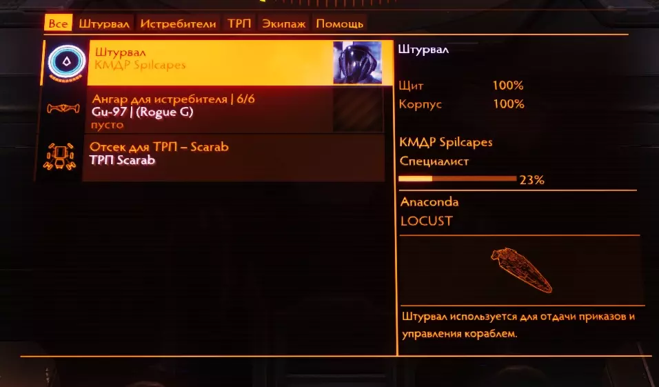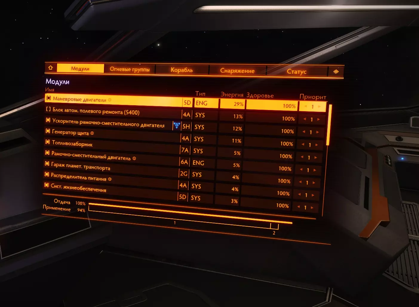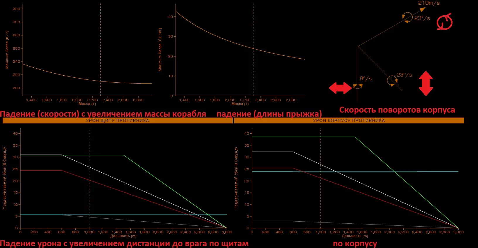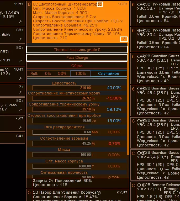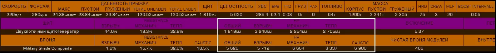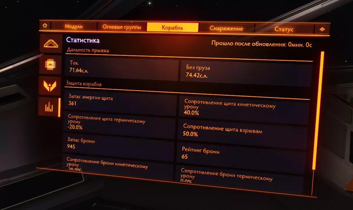 26. Фит кораблей Модификация корабля является самой важной частью в достижении эффективности вашего оборудования. В сравнении с полностью прокачанным кораблем, покупаемый вами изначально - просто мусор. У прокачки корабля есть 2 этапа: подборка нужного оборудования, покупка модификаций, инженеринг модификаций. Так-как про подходящие билды для каждого рода занятия я уже рассказал и даже уже скинул готовые, показал вам, как заработать денег на нужную вам модификацию, то перейдем сразу к тому, что еще не было написано в этом руководстве. А именно, я расскажу как распределяются модули и какие их функции. 27.1. Модули, их значение и применение. Обязательное оборудование Важная часть понимания корабля, помимо правильного пользования интерфейсом - это понимание принципа работы того или иного модуля. Модули - это детали корабля, которые выполняют определенную функцию. Да, звучит странно. По сути, весь корабль, полностью состоит из модулей, не считая всяких решеток и перекладин. Модули подразделяются по степени необходимости Основное оборудование - оборудование, которое стоит на любом корабле и выполняет основные функции. Без них, наш корабль не был бы кораблем, а был бы куском метала, а то еще хуже. Основное оборудование - это единственный вид оборудования, модули которого нельзя снять. Их можно только улучшить. Дополнительное оборудование - это модули, которые выполняют важные функции в корабле, но без которых можно прожить. Орудийные порты - Тут все понятно. Оружие необходимо независимым пилотам, которые так или иначе подвергаются риску нападения других кораблей, а именно торговцам и наемникам. Внешнее оборудование - модули, которые никак нельзя назвать важными или обязательными, но которые дают вашему кораблю приятные и, иногда даже, очень полезные плюшки, которые вам пригодятся в тех или иных ситуациях. Основные положенияРезисты (сопротивления) к разным типам урона работают так: если сопротивление к (например) кинетическому урону - 50%, то вам будет наносится в на 50% меньше урона, то есть 50%. Формула резистов такая, если a=наносимый урон, b=резист, то a=100 - b. Второй пример: резист (-85%), резист отрицательный, значит вам будет наноситься (100+85) 185% урона, вместо 100 - будьте осторожны! Все модули обладают показателями массы, прочности (целостность) и потребления энергии (мощность)! Увеличение массы равно уменьшению маневренности и дальности прыжка. Уменьшение прочности модуля до 0% приводит к его отключению. Основное оборудование Переборки (броня, корпус) - основная защита вашего корабля. Именно на ее прочность вы будете полагаться, если ваш щит будет снят. После снятия щита урон будет наноситься именно по броне. Обладает "резистами" к разным типам урона Показателем прочности Силовая установка Перерабатывает топливо в энергию для систем корабля. Грубо говоря, без силовой установки, ваш корабль - кусок бесполезной какули. Обладает показателями Мощность - тянет на себе потребление энергии модулями на всем корабле. Если силовая установка "не потянет" энергию на всем корабле, то все модули просто отключатся. Узнать потребление энергии разных модулей можно посмотрев на показатель "потребление энергии" перед покупкой модуля. Эффективность (тепловыделение) - силовая - это тот единственный модуль, который вырабатывает тепло на вашем корабле. Чем меньше эффек
