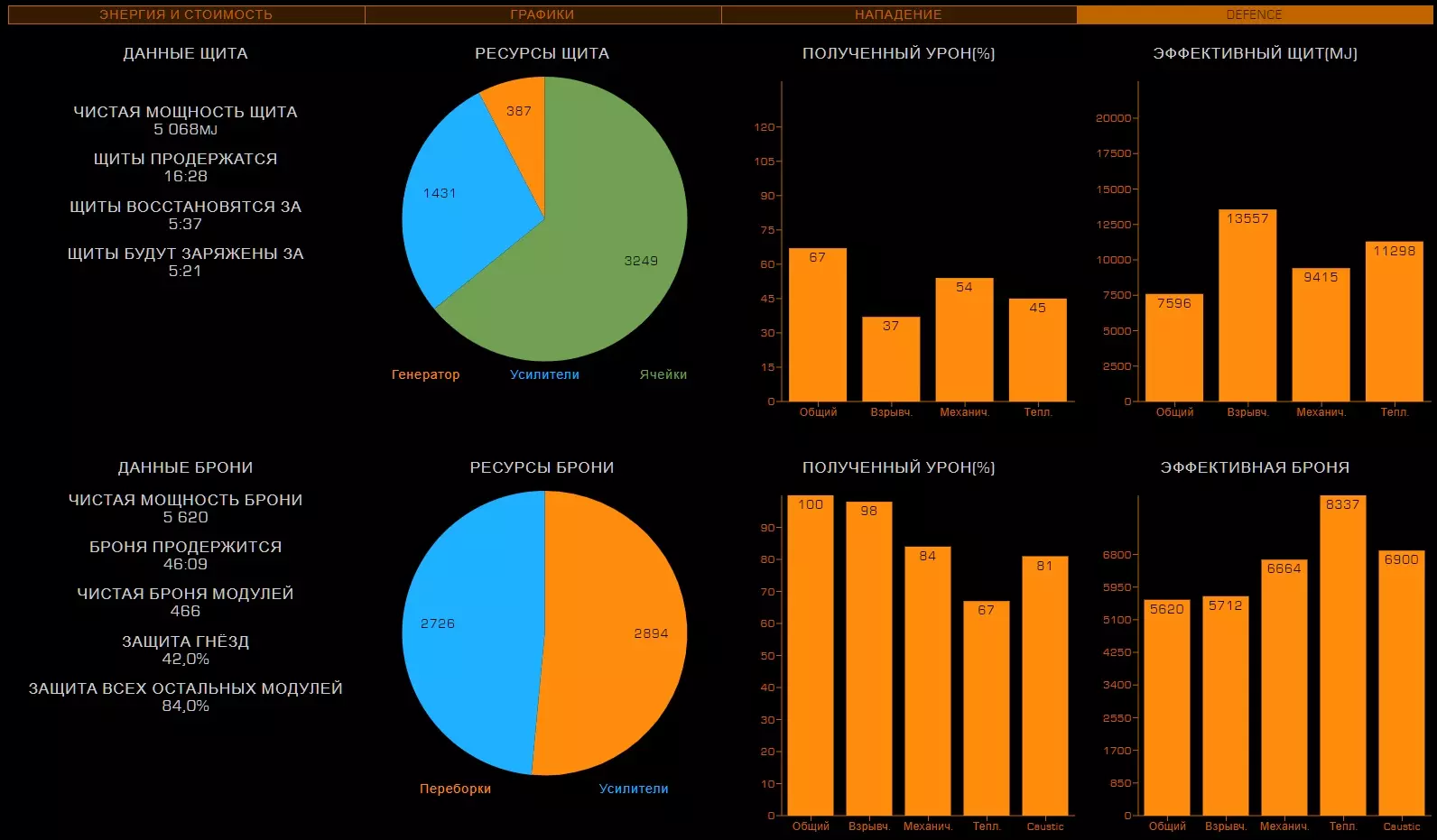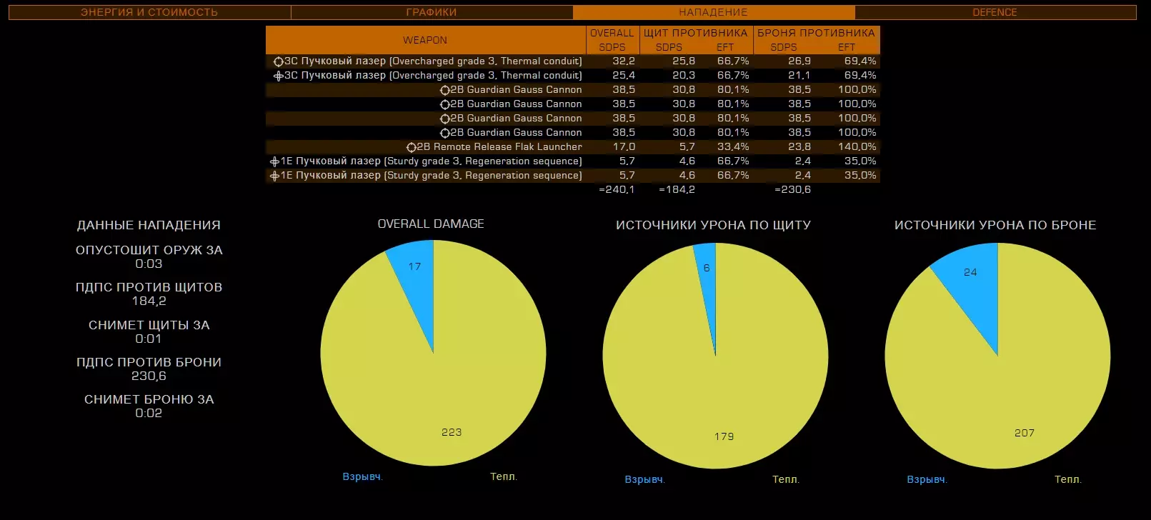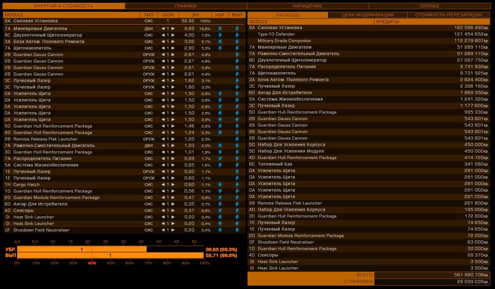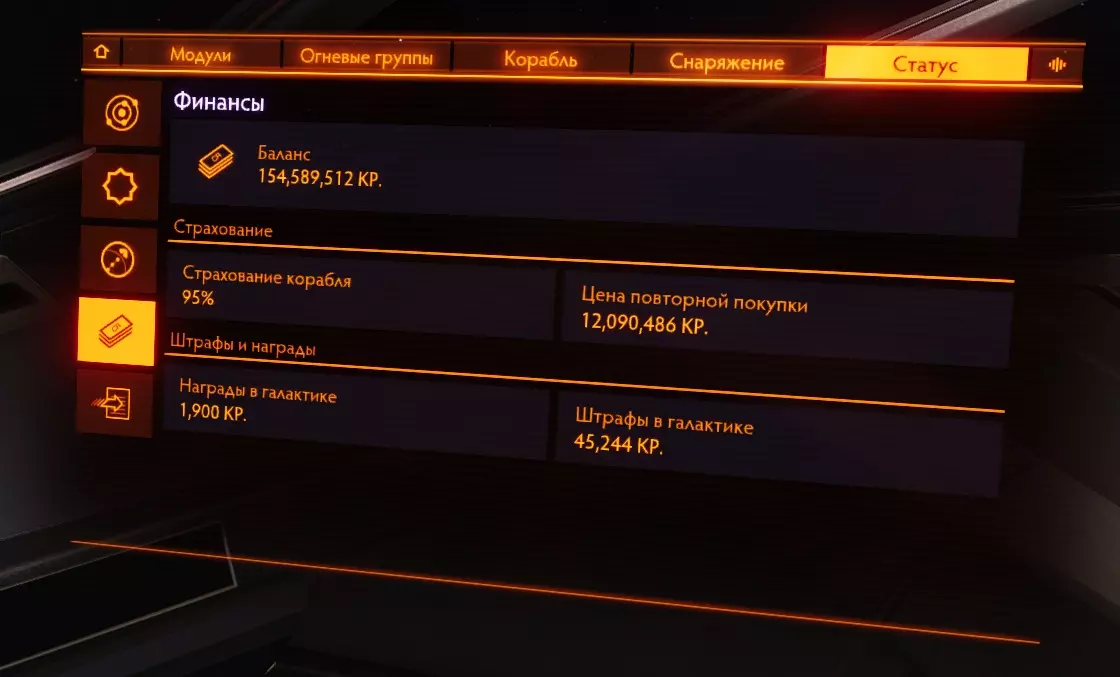 26. Фит кораблей Модификация корабля является самой важной частью в достижении эффективности вашего оборудования. В сравнении с полностью прокачанным кораблем, покупаемый вами изначально - просто мусор. У прокачки корабля есть 2 этапа: подборка нужного оборудования, покупка модификаций, инженеринг модификаций. Так-как про подходящие билды для каждого рода занятия я уже рассказал и даже уже скинул готовые, показал вам, как заработать денег на нужную вам модификацию, то перейдем сразу к тому, что еще не было написано в этом руководстве. А именно, я расскажу как распределяются модули и какие их функции. 27.1. Модули, их значение и применение. Обязательное оборудование Важная часть понимания корабля, помимо правильного пользования интерфейсом - это понимание принципа работы того или иного модуля. Модули - это детали корабля, которые выполняют определенную функцию. Да, звучит странно. По сути, весь корабль, полностью состоит из модулей, не считая всяких решеток и перекладин. Модули подразделяются по степени необходимости Основное оборудование - оборудование, которое стоит на любом корабле и выполняет основные функции. Без них, наш корабль не был бы кораблем, а был бы куском метала, а то еще хуже. Основное оборудование - это единственный вид оборудования, модули которого нельзя снять. Их можно только улучшить. Дополнительное оборудование - это модули, которые выполняют важные функции в корабле, но без которых можно прожить. Орудийные порты - Тут все понятно. Оружие необходимо независимым пилотам, которые так или иначе подвергаются риску нападения других кораблей, а именно торговцам и наемникам. Внешнее оборудование - модули, которые никак нельзя назвать важными или обязательными, но которые дают вашему кораблю приятные и, иногда даже, очень полезные плюшки, которые вам пригодятся в тех или иных ситуациях. Основные положенияРезисты (сопротивления) к разным типам урона работают так: если сопротивление к (например) кинетическому урону - 50%, то вам будет наносится в на 50% меньше урона, то есть 50%. Формула резистов такая, если a=наносимый урон, b=резист, то a=100 - b. Второй пример: резист (-85%), резист отрицательный, значит вам будет наноситься (100+85) 185% урона, вместо 100 - будьте осторожны! Все модули обладают показателями массы, прочности (целостность) и потребления энергии (мощность)! Увеличение массы равно уменьшению маневренности и дальности прыжка. Уменьшение прочности модуля до 0% приводит к его отключению. Основное оборудование Переборки (броня, корпус) - основная защита вашего корабля. Именно на ее прочность вы будете полагаться, если ваш щит будет снят. После снятия щита урон будет наноситься именно по броне. Обладает "резистами" к разным типам урона Показателем прочности Силовая установка Перерабатывает топливо в энергию для систем корабля. Грубо говоря, без силовой установки, ваш корабль - кусок бесполезной какули. Обладает показателями Мощность - тянет на себе потребление энергии модулями на всем корабле. Если силовая установка "не потянет" энергию на всем корабле, то все модули просто отключатся. Узнать потребление энергии разных модулей можно посмотрев на показатель "потребление энергии" перед покупкой модуля. Эффективность (тепловыделение) - силовая - это тот единственный модуль, который вырабатывает тепло на вашем корабле. Чем меньше эффек