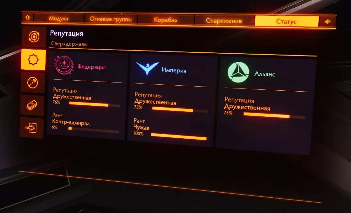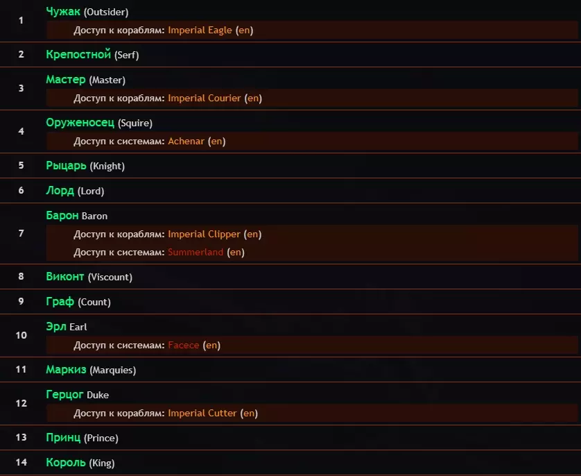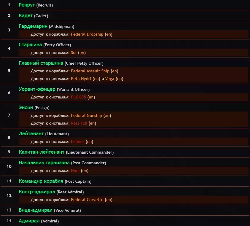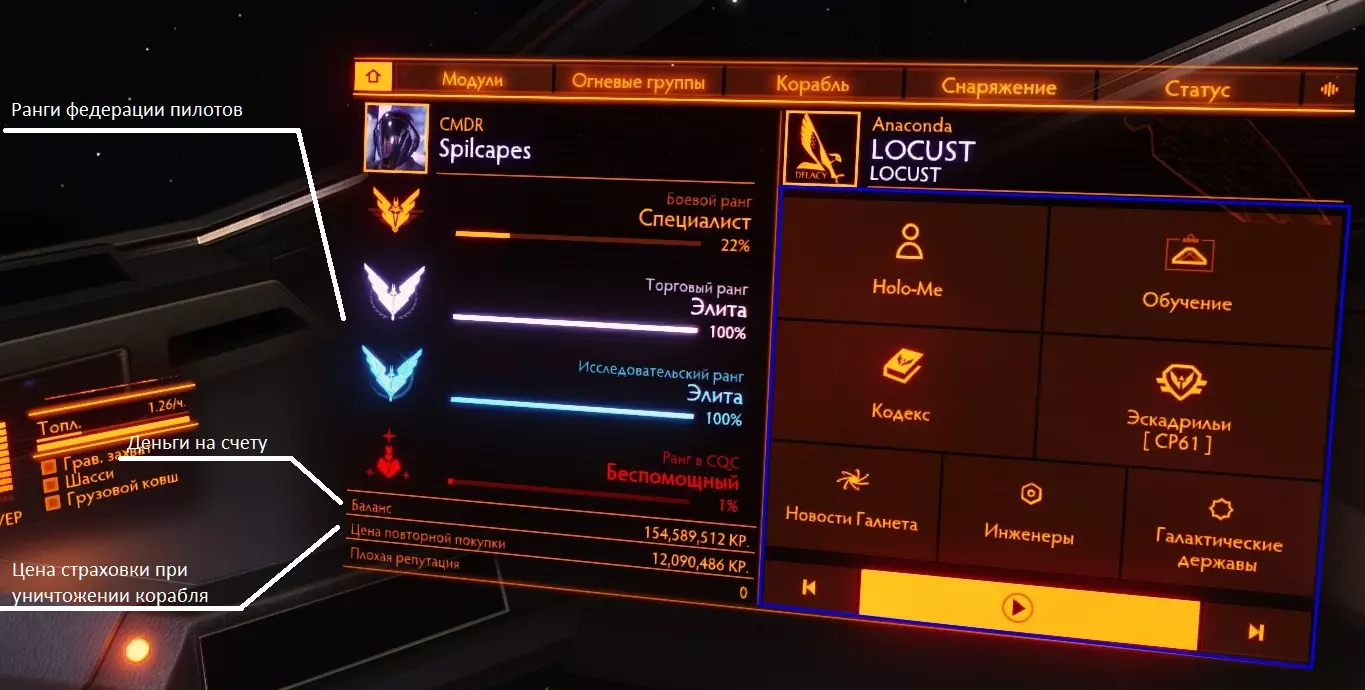 飞行员联邦军衔 - 所有飞行员默认都属于飞行员联邦,在联邦中他们会因战斗行动、贸易和研究获得军衔。军衔分为四种类型:战斗、贸易、研究和近距离格斗(CQC)。军衔的提升取决于你在这些领域的成就,即分别取决于消灭敌人的数量、赚取的金钱以及发现的成果。你的目标是达到最高等级【ЭЛИТА】 关于蓝色突出显示的标签页,我们将在“游戏地图和第四面板标签页设置”部分进行讨论。