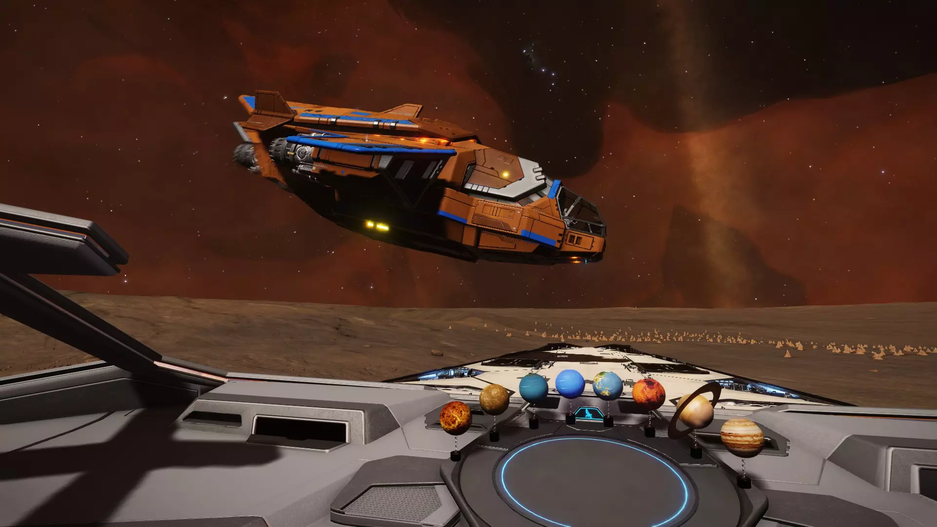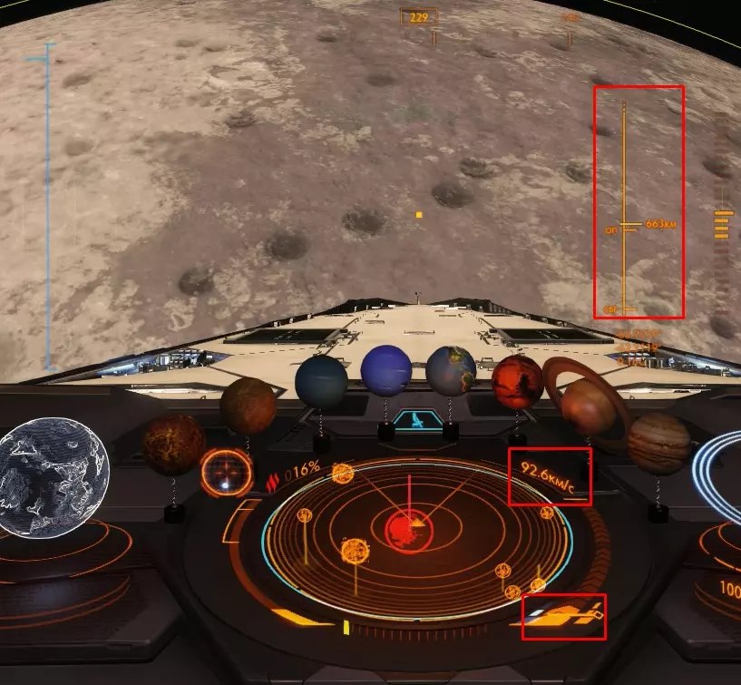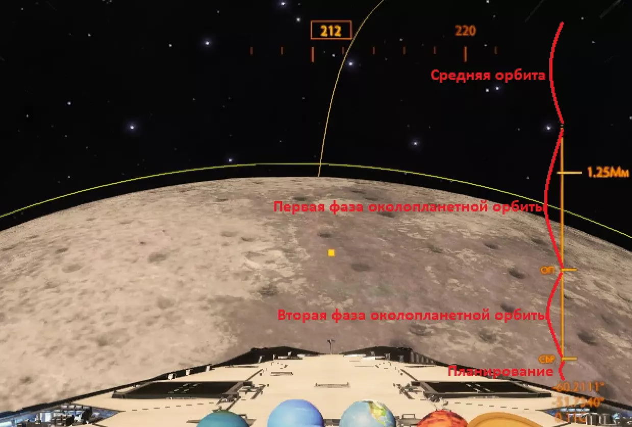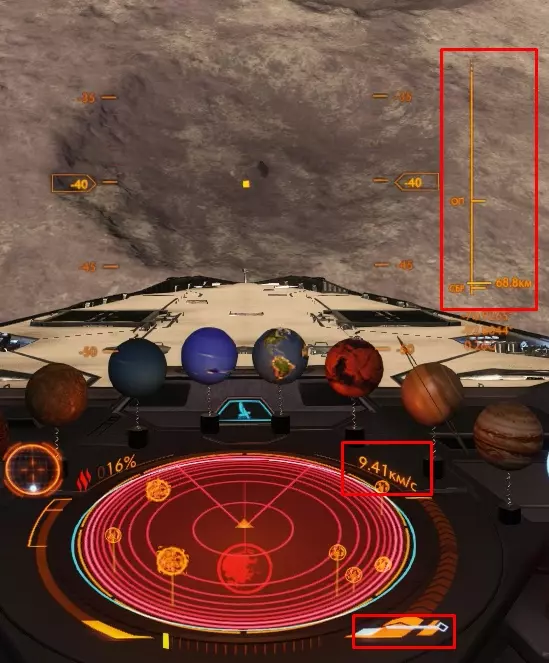 接下来是近地轨道阶段。在这些阶段中,除了速度调节外不会发生任何特别的事情。 在第一阶段,屏幕中央右侧会出现一个滑块,显示您的飞船与行星表面的距离。该滑块上标有3条线,这些是阶段转换点。滑块右侧还会出现一个刻度,用于确定您的飞船向行星表面“坠落”的力度。