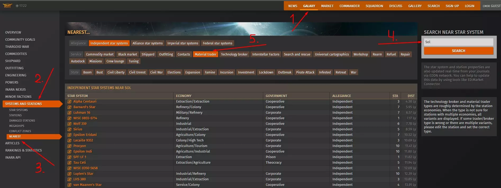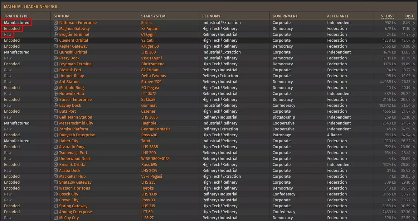 2. 星系 3. 星系和空间站 4. 最近 5. 您当前的星系 6. 材料商人 7. 接下来查看商人状态。制造类商人 - 交换工业材料。编码类商人 - 交换数据。原材料商人 - 交换原材料。