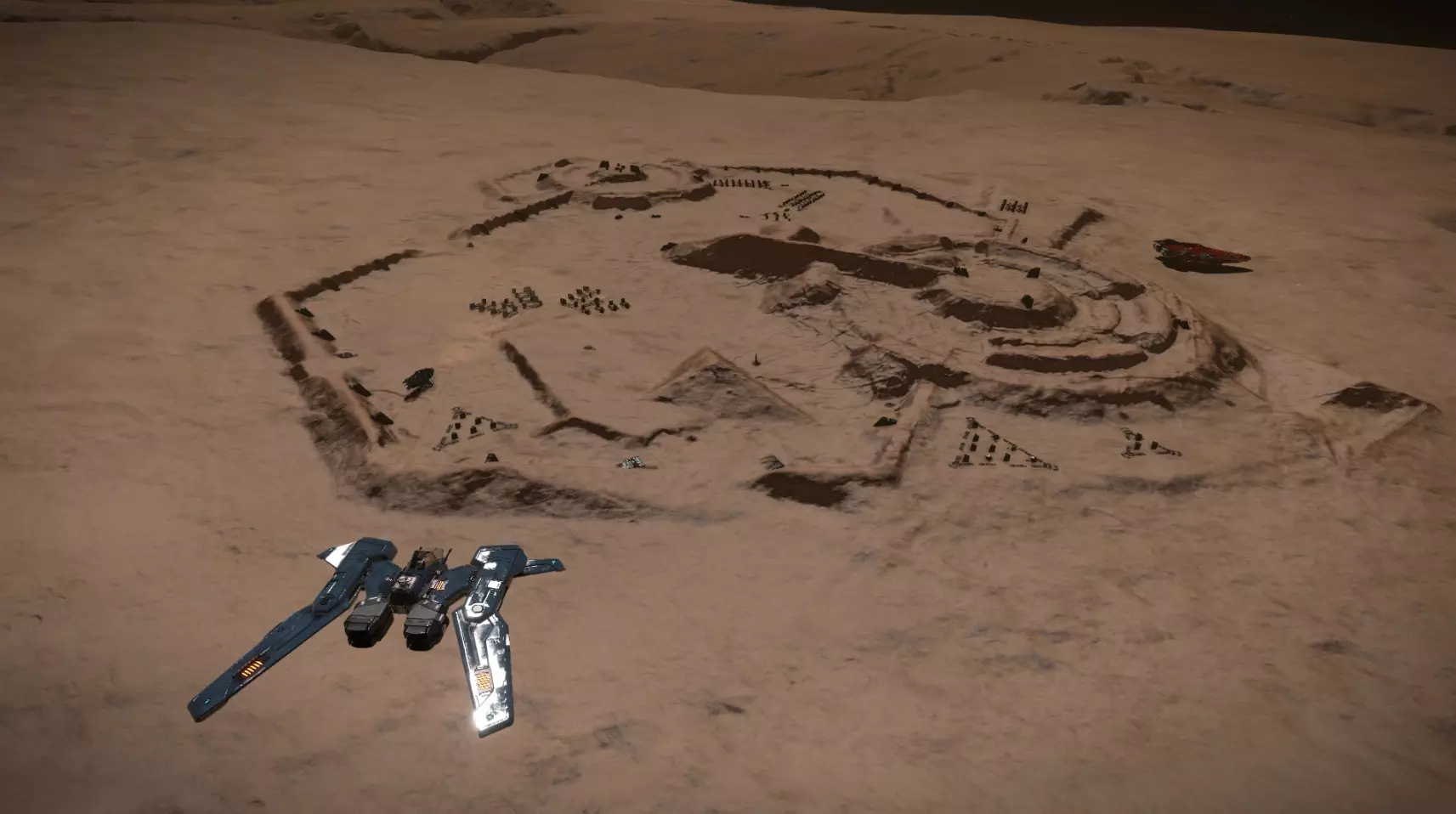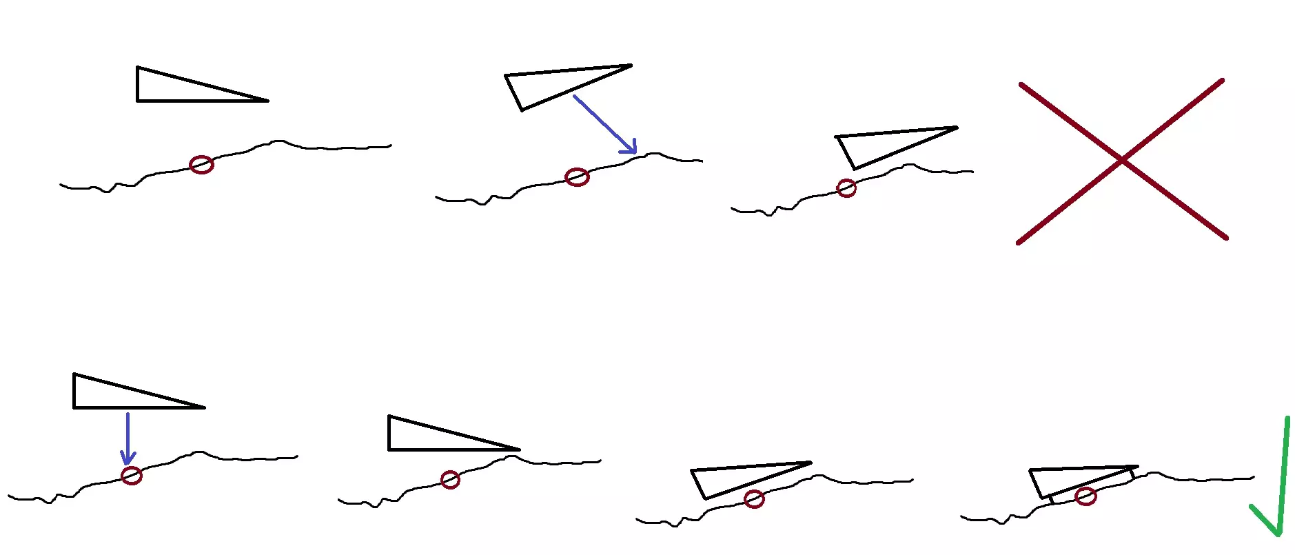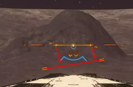 在这个标记处停下,首先将飞船调整至与地平线呈0度角!(这需要在以最大距离接近行星表面之前完成,因为开启垂直推进器可能会让你错过合适的着陆地形。我在图中大致描绘了这个过程)然后提供垂直速度,并在距离地面10米的标记处停下。之后,请将船体调整至着陆角度,并进行最后冲刺。