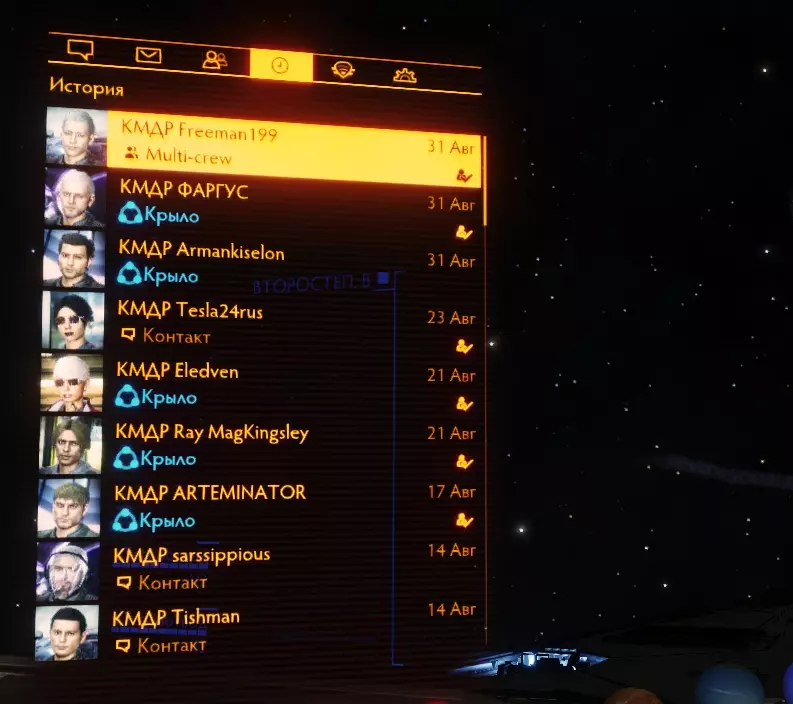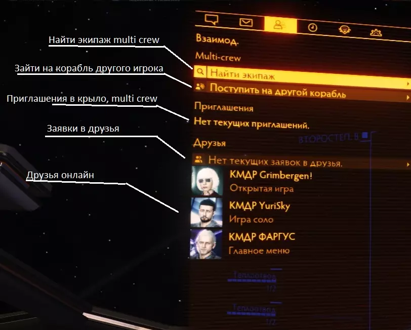 【飞行联队】是一种特殊的玩家群体。加入飞行联队后,你将可以参与联合作战任务并获得奖励。你可以邀请好友加入飞行联队,一同飞行。邀请好友加入飞行联队的方法是:点击好友,然后选择“邀请加入飞行联队”。 多人机组是一项允许玩家共同乘坐同一艘飞船的服务。第二名飞行员同样可以操控支持多人机组的模块、战斗机以及炮塔武器。当飞行员连接到作为“主机”的飞船时,无论其身处何处,都会立即移动到副驾驶/第三驾驶的空位上,而他自己的飞船则会“退出”游戏世界并处于安全状态。