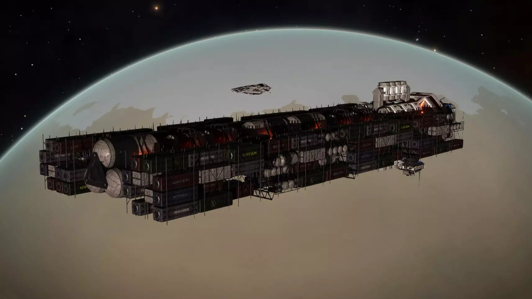 拖拽舰 这些大型舰船仅用于开放宇宙。它们通过特殊的【铲斗】收集路径上遇到的所有物体,无论是宇宙尘埃、垃圾还是碎片。在宇宙中长时间航行后,它们会返回仓库进行加工处理。