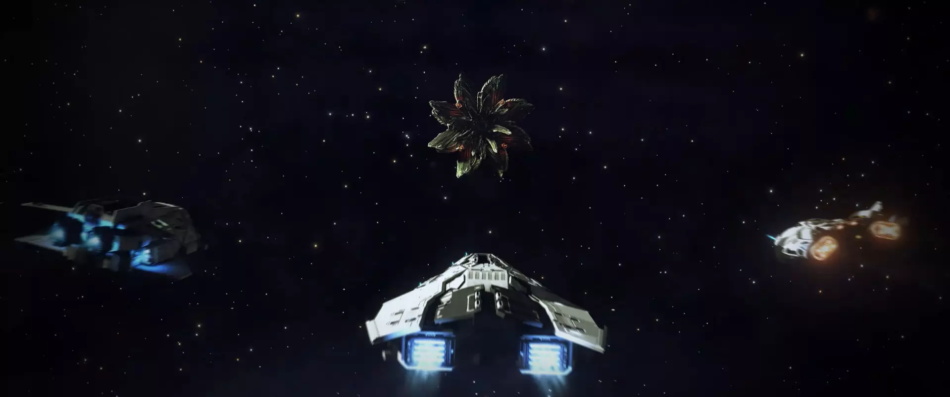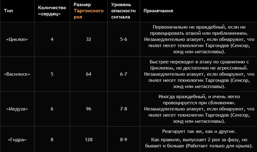 塔贡集群 当有人靠近时,拦截机会发出深红光芒并释放一群无人机——塔贡机。攻击拦截机会导致塔戈伊德立即开始攻击,释放塔贡集群。塔贡机速度极快,配备精良武器,能够穿透护盾并对机体造成直接伤害。塔贡虫群有2种攻击方式: 1) 它会围绕你的飞船旋转并对船体造成伤害,无视护盾 2) 一段时间后,虫群会开始向你发射火箭 应对方法: 1) 使用遥控爆破弹药。但不要立即消灭虫群。需要将虫群削弱至剩余1-6只塔贡虫(虫群中的塔贡虫数量可在锁定虫群时于左下角查看)。在这种状态下,集群几乎不会造成伤害,并且主塔戈伊德拦截者不会召唤新的集群——这将为你节省弹药,最重要的是节省时间,还能让你专注于消灭塔戈伊德拦截者。攻击塔戈伊德的时机应该是它们沿着可预测轨迹移动时,也就是向你或你的队友移动的时候。 2) 牵制行动。一艘或多艘舰船必须配备战斗机,以执行牵制机动。同时,需要向战斗机部队下达指令