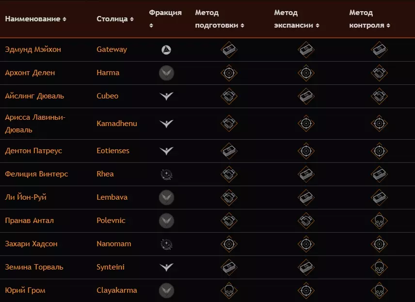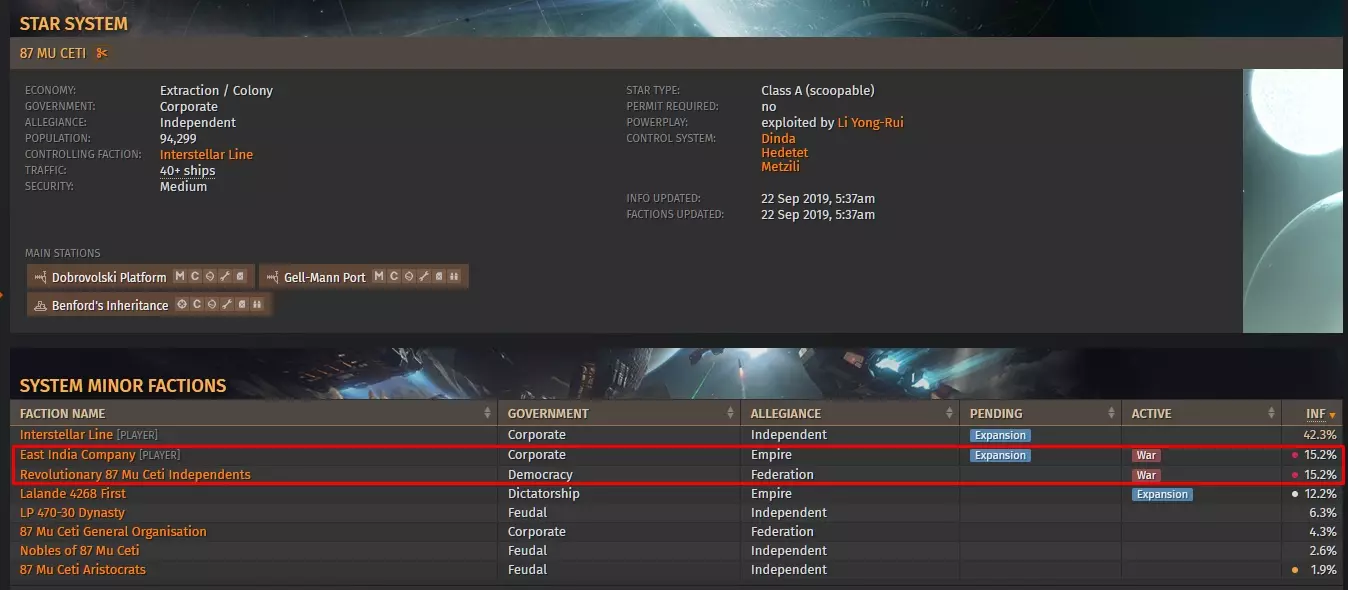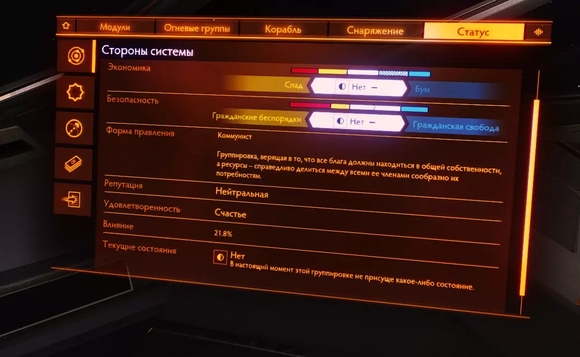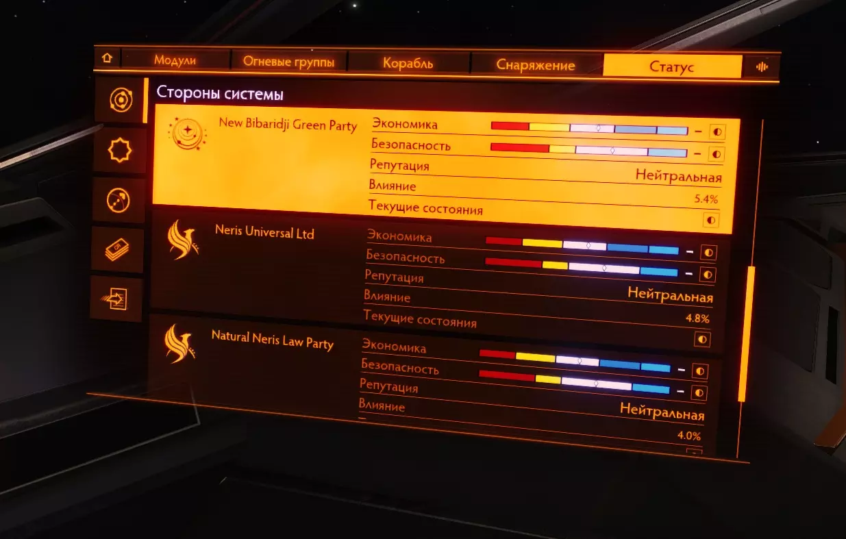 当前系统中的势力及其参数。有关势力的详细信息,请参见【力量游戏】部分。