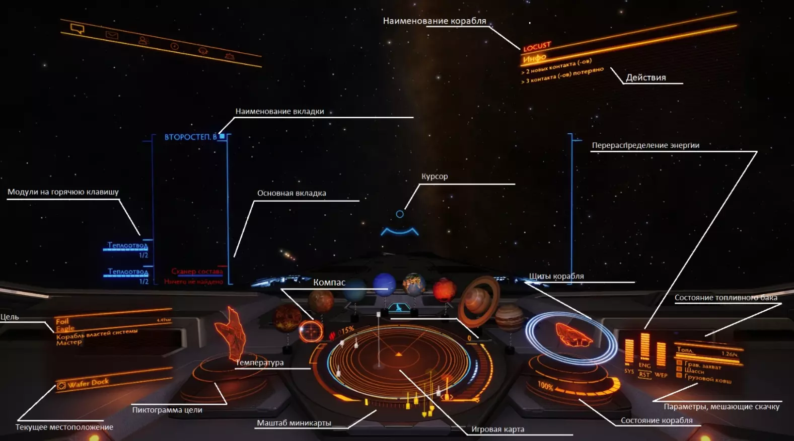 接下来详细说明部分要点 目标 目标是指你按T键“锁定”的对象 选项卡(火力组):是指在“火力组”选项卡的4个面板中分配的模块组合。有关详情,请参见“游戏地图与面板装置”中的“火力组”小节 指南针 显示舰船与已指定目标的相对位置如果罗盘上的点是实心的,说明飞船正朝向目标;如果是空心的,则说明飞船背向目标。 温度 飞船会升温和降温。升温是由“动力装置”引起的——这是一个必备模块,它同时控制着飞船上的所有其他模块。无论如何,我们还需要处理分别通过数字1234激活的面板。第一个面板当任何模块开始高负荷运行时(例如:你使用加力、FSD引擎准备跳跃),热量便会传导至动力系统并使飞船升温。此外,飞船也会因外部因素而升温,例如:靠近恒星、进入大气层、遭受武器攻击。一旦温度指示超过100%,船体就会开始受到损伤。130% - 伤害同样会作用于模块。350%-400% - 舰船会自动被摧毁。 小地图缩放 通过Pg Up、Pg Dn键进行调节 游戏地图 黄色图标 - 实体对象,灰色图标 - 非实体对象。 引擎量表(小地图右侧) 量表上的横线 - 引擎节流阀 中间的彩色分段 - 你的当前速度。速度值会向节流阀位置靠近!速度条进入左侧蓝色区域意味着最大机动性,因为发动机的所有组件在不同方向上的指向相同! 舰船护盾 当护盾呈蓝色时,它们会吸收所有对您舰船造成的动能伤害。(有关伤害类型的详细信息,请参见“舰船配置”部分)吸收一定量的伤害后,护盾将关闭,之后伤害将直接作用于船体。(极少数情况除外。详情请见“战斗”和“舰船配置”部分)。护盾会随时间恢复。 能量分配 通过箭头键进行操作。某一类别获得的【能量点数】越多,该类别的效率就越高。 SYS - 负责护盾效率及其充能时间。 ENG - 负责速度、机动性以及推进器的充能。 WEP - 负责武器的持续使用时间及其充能。 向下箭头 - 平衡能量分配。燃料箱状态 如果燃料箱中的所有燃料耗尽,你飞船上的大多数重要模块将关闭,同时宇航服的维生系统会启动,提供氧气和热量。当氧气耗尽时,角色将死亡。阻碍跳跃的参数 阻碍跳跃或从推进模式切换至超光速巡航模式的参数如下: 【引力捕获】:当您的飞船靠近巨型物体(如空间站、行星或大型飞船)时出现。若要解除,需驶离该物体。 【起落架】:用于对接或着陆。若要收起,按L键。 【货舱铲斗】:用于收集材料、物品等。激活后,小地图左侧会出现准星。要收集物品,需将速度降至40-1,使准星变为蓝色,且物品位于准星中央。按K键可关闭准星。 插槽:如果插槽已解锁,意味着其中的模块已解锁,例如插槽中可安装武器。按U键可关闭插槽界面。 呼,基础界面的介绍就到这里了。不是很难,对吧?