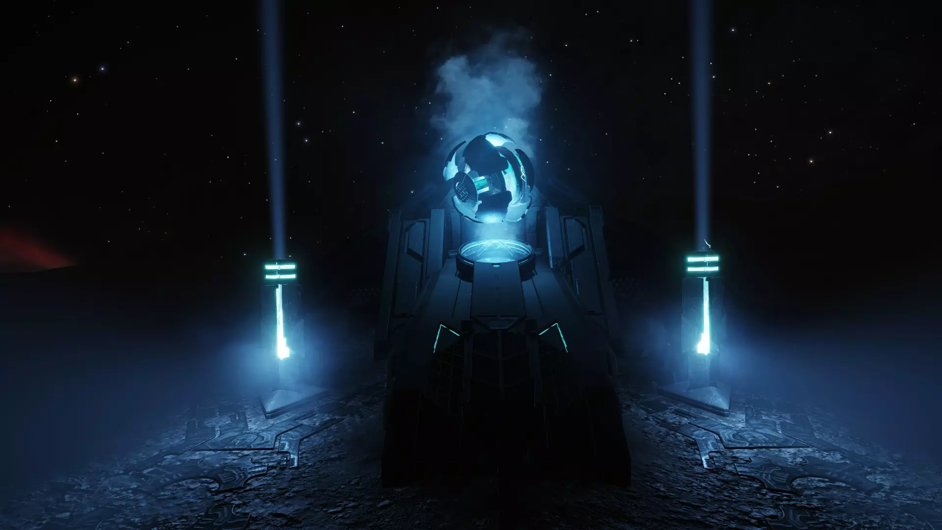 图片中显示的是已激活的古老终端。若要收集资源,需激活古老终端,等待其内部出现发光核心。使用安装在TRP上的【数据通道扫描仪】扫描该核心。要激活古老终端: 1. 激活所有【电力塔】 2. 从【多层石柱】收集物品【古老遗物】/从【守卫灯塔】收集物品【古老钥匙】 3. 靠近终端,将【古老遗物】(若为武器终端或模块终端)/【古老钥匙】(若为提供舰船蓝图的终端)放置在其前方面板上