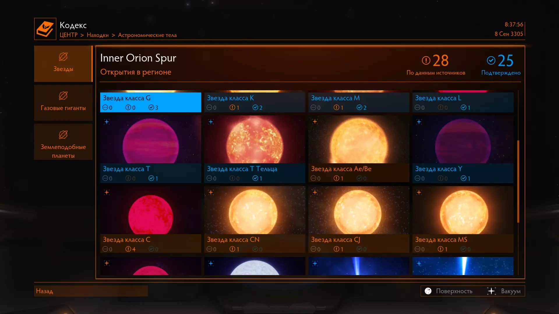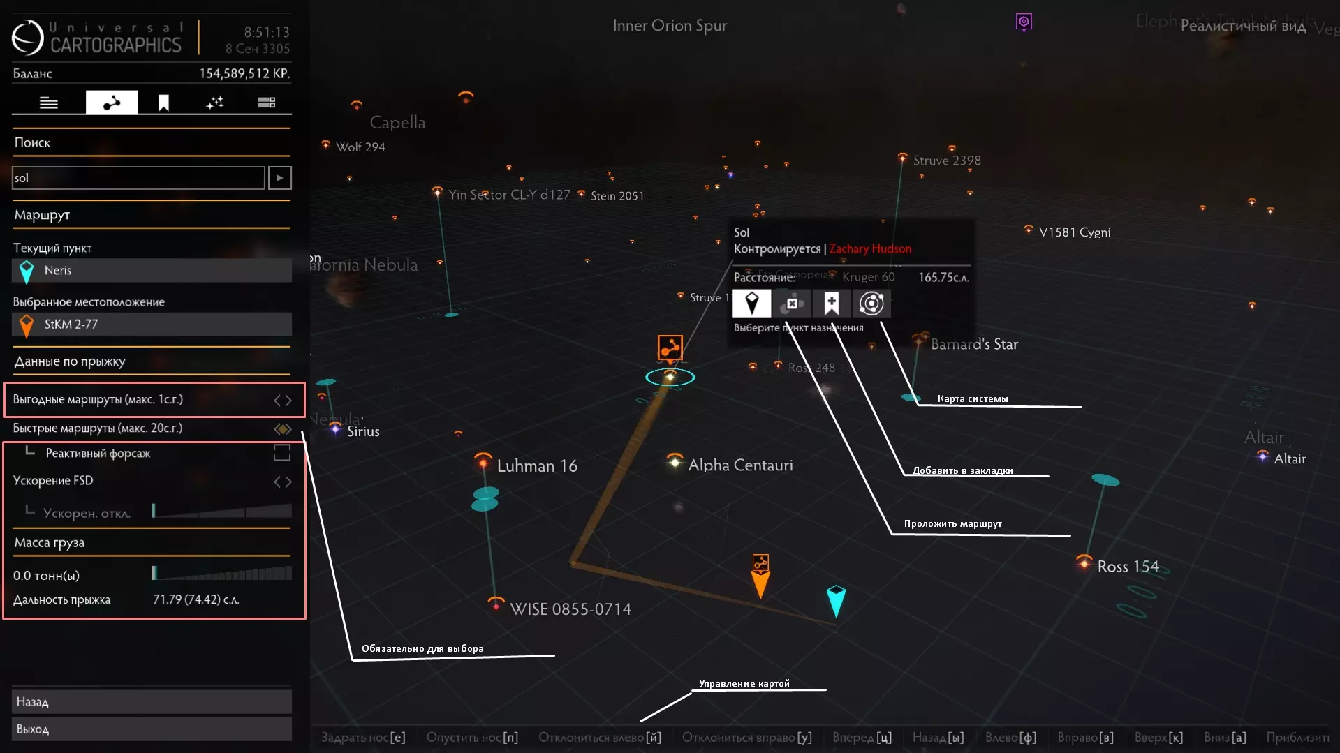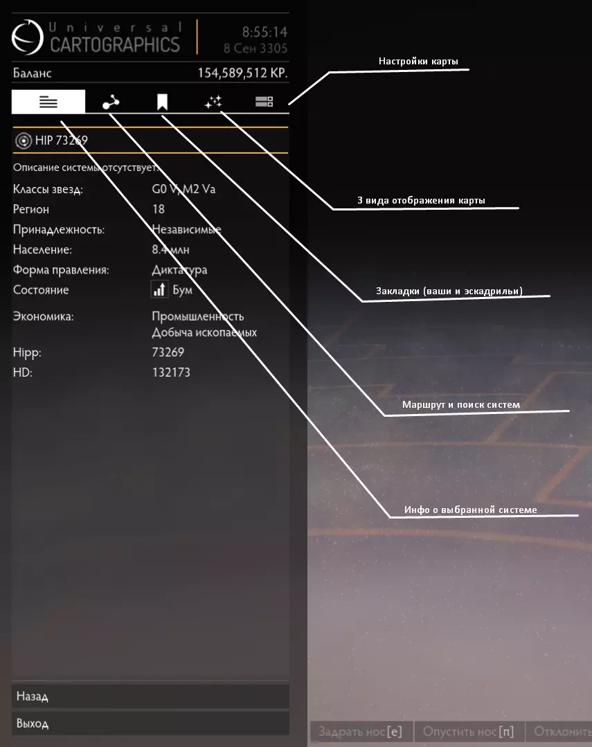 这里很简单。这里标记了系统中的所有天体以及邻近系统。天体按距离排序,但恒星除外。 如果按空格键点击天体,将打开此面板。
