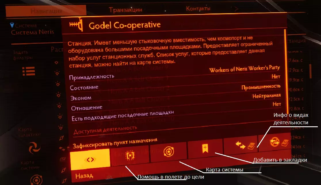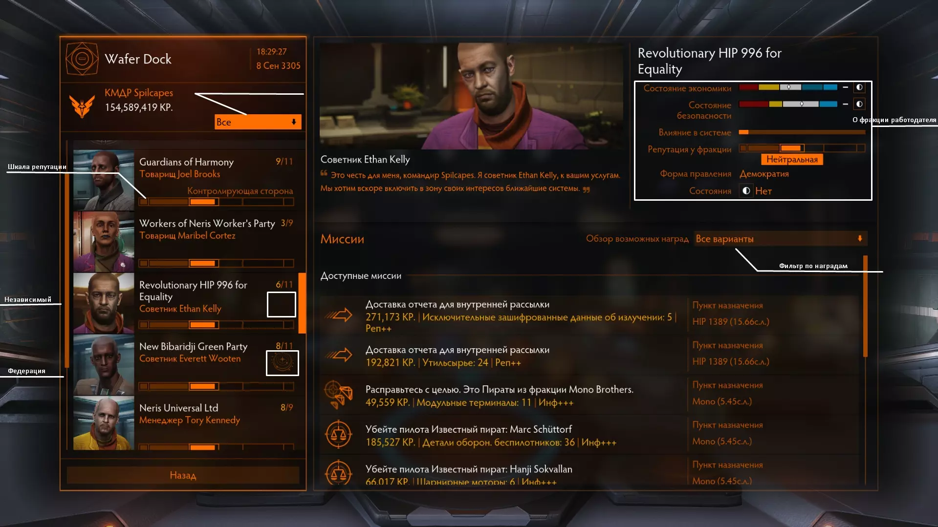 凭证 - 可以将其兑现以获取金钱。兑现操作可在空间站的联络处进行,需前往发布奖励的势力所在位置。或者在其他空间站通过法律服务兑现,但会产生一定比例的手续费(同样在空间站联络处办理)。 任务 - 在交易界面中,选中任务后按下空格键,即可查看该任务的全部信息。罚款可以在您实施违法行为的空间站的当局联系人处或法律服务处缴纳。联系人选项卡会显示离您最近的相关地点。这部分没有更多需要说明的内容。