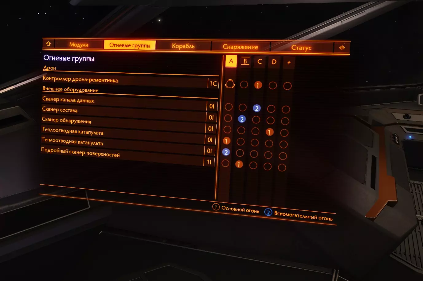 关于火力组的简要说明。A、B、C、D代表不同的选项卡。数字1和2分别对应鼠标左键和右键。 查看截图可知,我在B选项卡中为鼠标左键分配了表面详细扫描仪,为鼠标右键分配了成分扫描仪。在C选项卡中,我为鼠标左键分配了维修无人机控制器,为鼠标右键分配了数据通道扫描仪。也就是说,按下N键将火力组切换到C后,我就能通过点击鼠标使用所需的模块了。