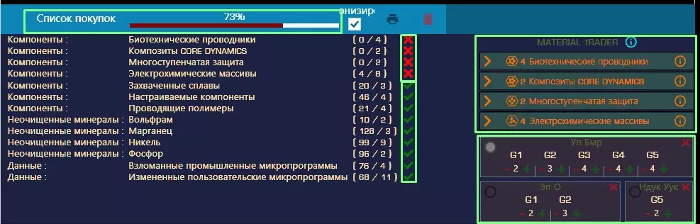 将鼠标光标悬停在不同的符号上,即可查看它们的含义。 请注意图片上的高亮区域。ED工程师工具的使用非常简单。左侧是您的组件和物品(列表会与游戏实时同步)。右侧是工程师蓝图以及蓝图所需的组件列表。 如何将蓝图添加到【购物清单】中?要将图纸添加到【购物清单】,需先找到该图纸(建议使用右上角的筛选器)。确定图纸等级。添加图纸的数量为:螺母+1,即第1个螺母对应2个图纸,第4个螺母对应5个图纸。