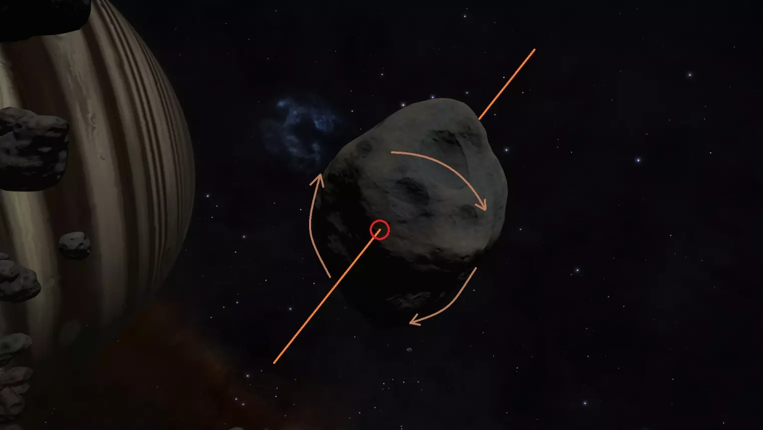 找到星系后,飞往那里并寻找集群的交叉点。进入集群在某一点交叉的区域,就像图片中那样。 采集 找到目标小行星后(小行星的内含物与其外观无关),你需要分析它的移动速度和轨迹。问题在于,当开始通过“通道激光”在小行星表面行进时,需要尽量减少小行星的旋转,以防止无人机自毁。在精英难度下,小行星会绕自身轴心旋转,有时转速非常快。因此,你需要找到小行星转速最低的位置,也就是旋转轴。看图,我们关注的是红色圆圈。