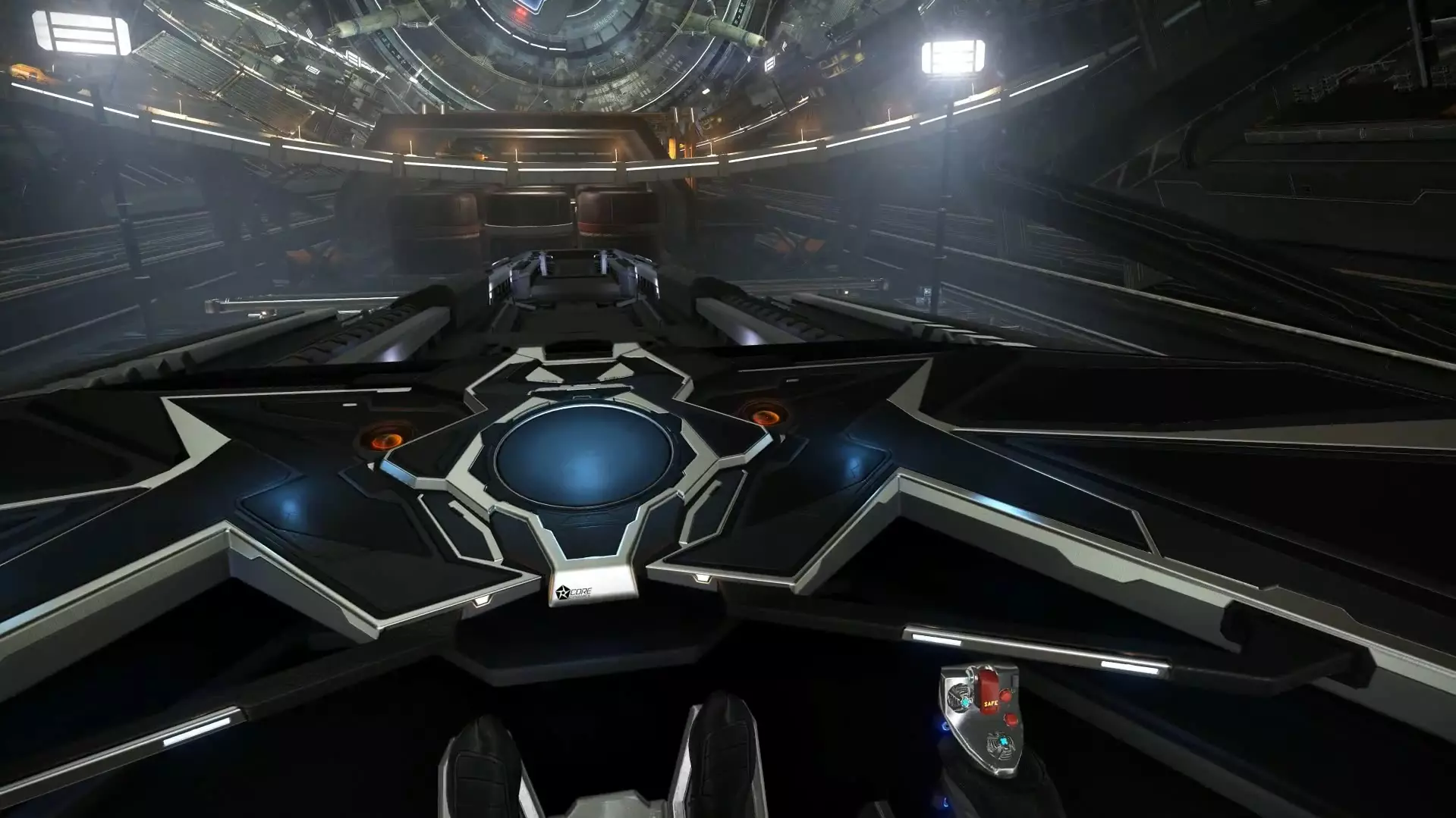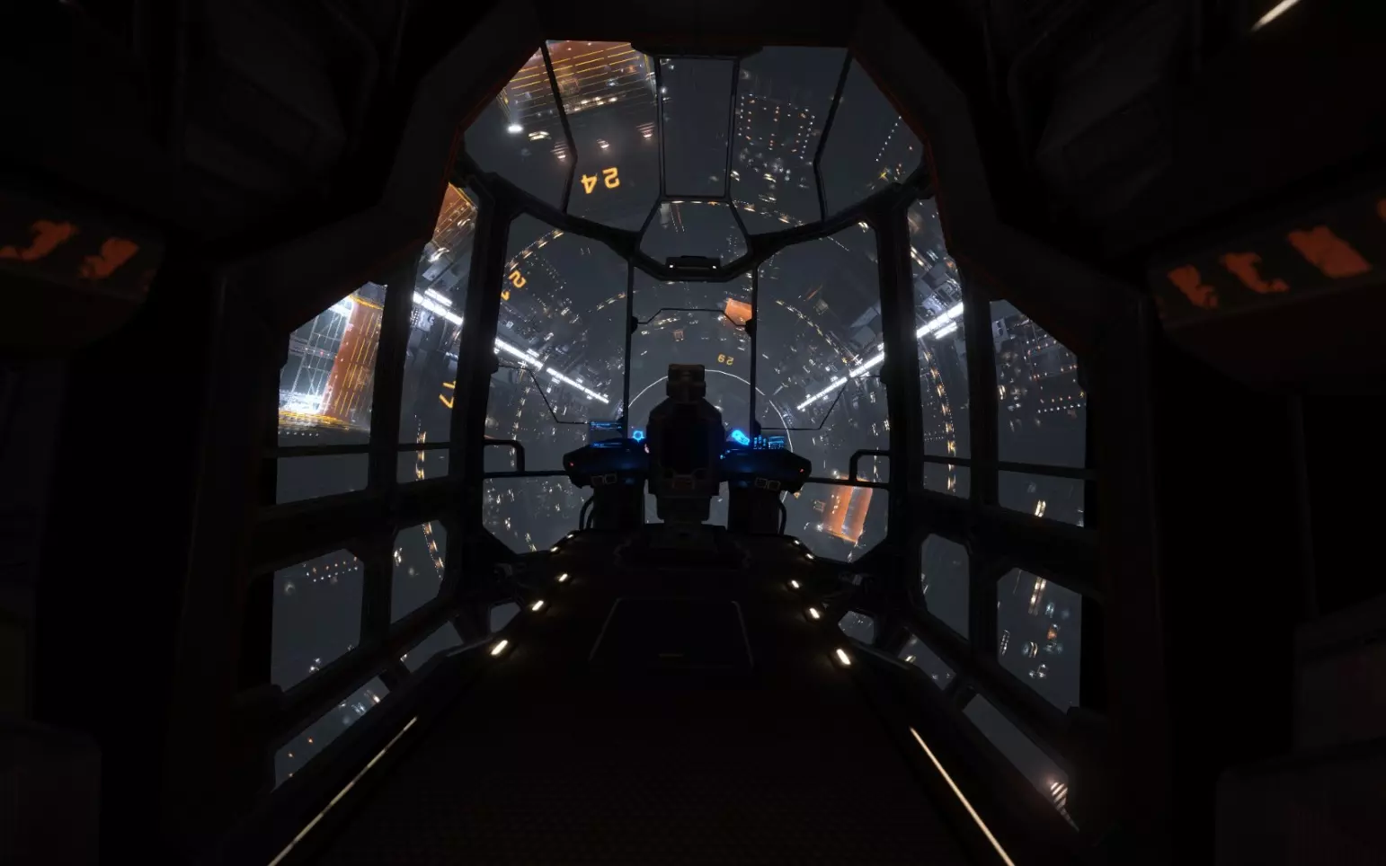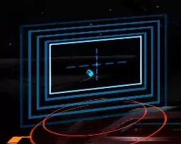 接下来,以较低速度驶入蓝色区域,确保飞船垂直进入,让入口的窄边位于你的两侧。完全穿过蓝色区域后停下,环顾四周寻找你的位置。找到对接位置后,靠近并悬停在其上方,保持起落架朝下。尽可能靠近对接位置,直到驾驶舱中央出现你的飞船图标。