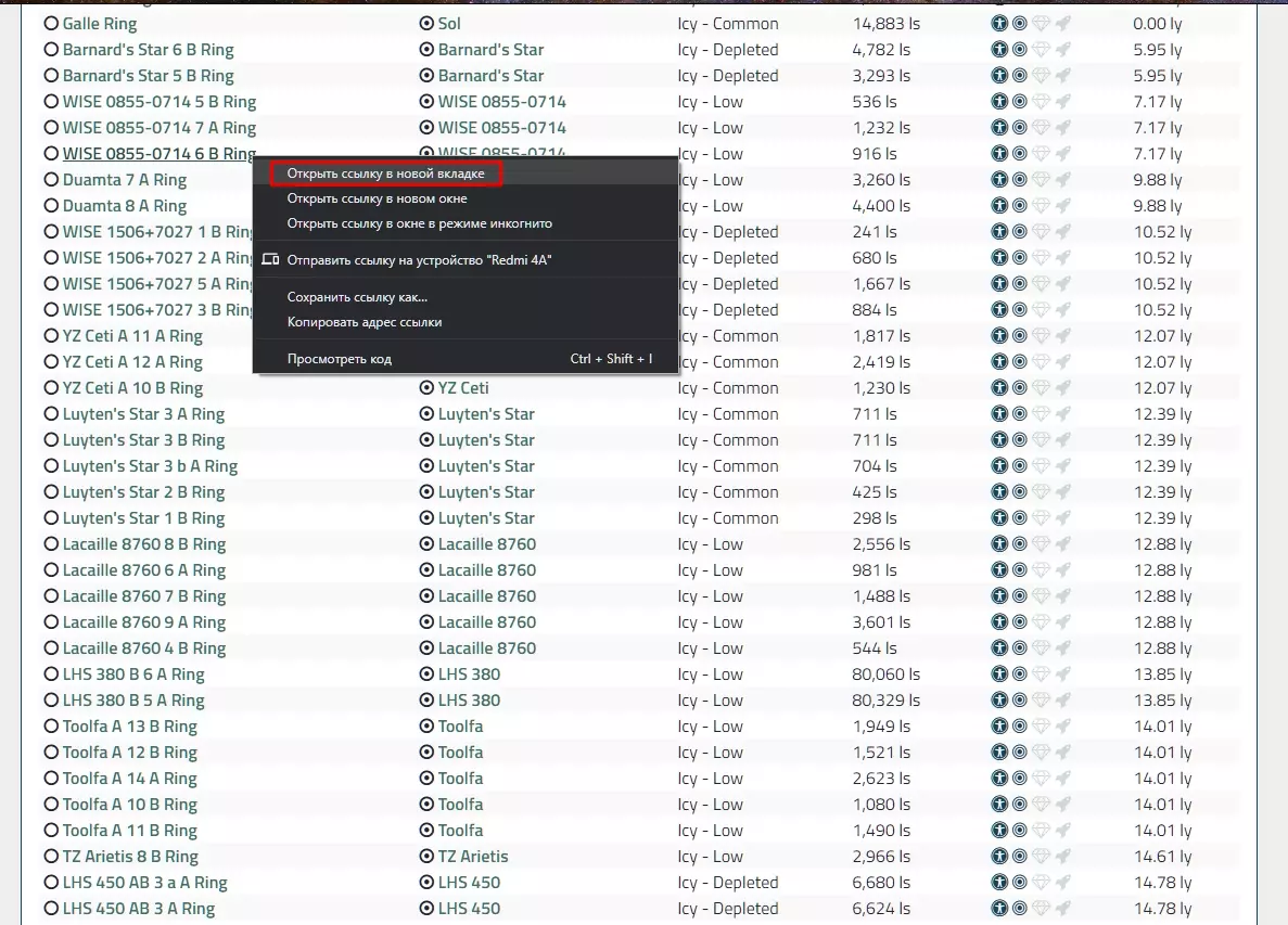 使用【详细表面扫描仪】探测器射击星环,如果存在多个星环,则需全部射击。退出战斗模式后,星环上会显示橙色区域,这些是矿石富集区。星环质量越大,橙色区域的半径就越大。在1号面板的第一个标签页中,可以查看这些区域的矿石成分。首次扫描星环后,各区域的半径名称将永久保留。反复回到同一个区域并没有什么不好。不过,如果区域附近有采矿站,区域内的矿石数量可能会随着时间减少。 第二点是海盗。当你选择好目标区域后,只需将节流阀调至100并飞向目标。不要直接飞入区域中心,而是飞到大约区域半径的一半位置。那里有足够的矿石,但海盗数量相对较少。进入游戏区域后,通常会有海盗出现。他们会扫描你,如果没有发现有价值的物品(他们会忽略无人机),就会离开。尽量不要立即开始开采,先等待一分钟。如果海盗没有出现,之后就不会再出现了。但是,如果你重新进入游戏或再次进入该区域,他们很可能会刷新,所以不要在满载货物的情况下这样做。如果有海盗盯上你,他们就会紧追不舍,你得把船上的货物卖掉,才能安心采矿。也就是说,一旦有海盗盯上你,就没法安心挖矿了。所以最好在装满货舱或者准备离开前,不要重新进入游戏,也不要重新进入星环。 海盗也可能在超光速巡航模式下拦截你。正因为如此,你需要一艘机动性相对较好的飞船,而不是一艘完全笨重的“桶”。如果被抓住了——可以使用alt+f4快捷键,要是你有强大的护盾并且拥有脱身手段(热沉、 dipole reflectors、point defense),那么可以尝试摆脱。同一个海盗不会拦截你第二次。 8.2. 贸易(深渊蛋白石开采,寻找采矿地点) 深渊蛋白石开采 适用于Coriollis的采矿飞船配置首先我们需要找到合适的星环。在EDDB网站上点击:天体,星环类型(冰质),天体组(星环),最大抵达距离(2000),参考星系(你的星系),查找天体。此时会显示一个列表。现在按ref名称升序排序。接下来你需要在新标签页中打开所有(至少20个)星环名称。然后依次打开每个环并查看质量属性。理想情况下,它应该达到1万亿(1,000,000,000.00),并且属于冰环。