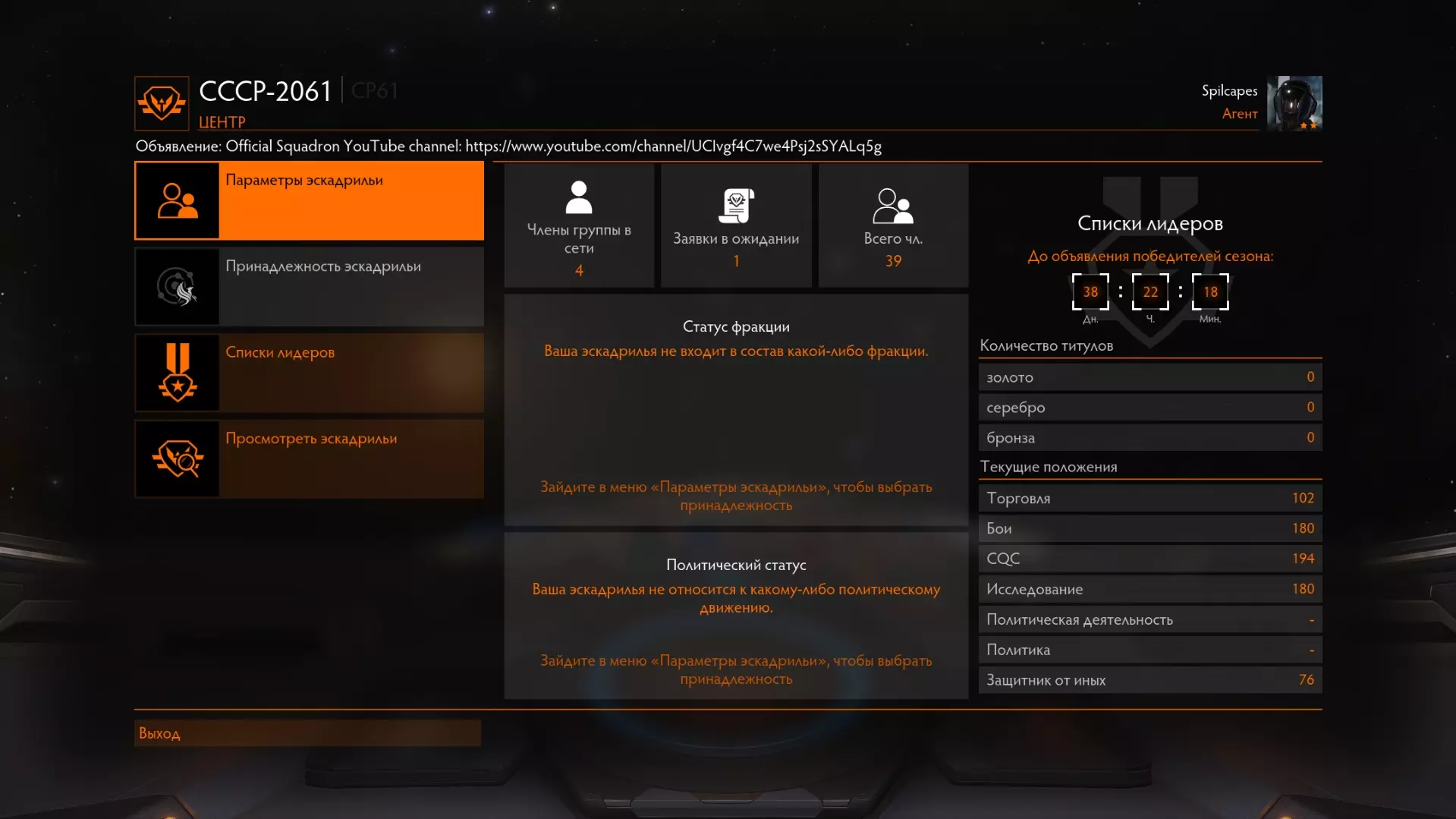 这里的操作也很简单。右侧显示的是您的飞行中队所占据的位置。 中间是飞行中队的基本信息。 参数 - 飞行中队的参数和详细信息 领袖列表 - 世界领袖 查看飞行中队 - 搜索飞行中队 3.5. 太空港服务