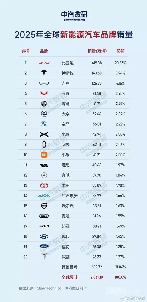 根据中汽数研发布的2025年全球新能源汽车销量排行榜,中国品牌在前十名中强势占据七个席位,比亚迪以绝对优势位居全球销冠,多家中国新老势力品牌销量齐头并进。