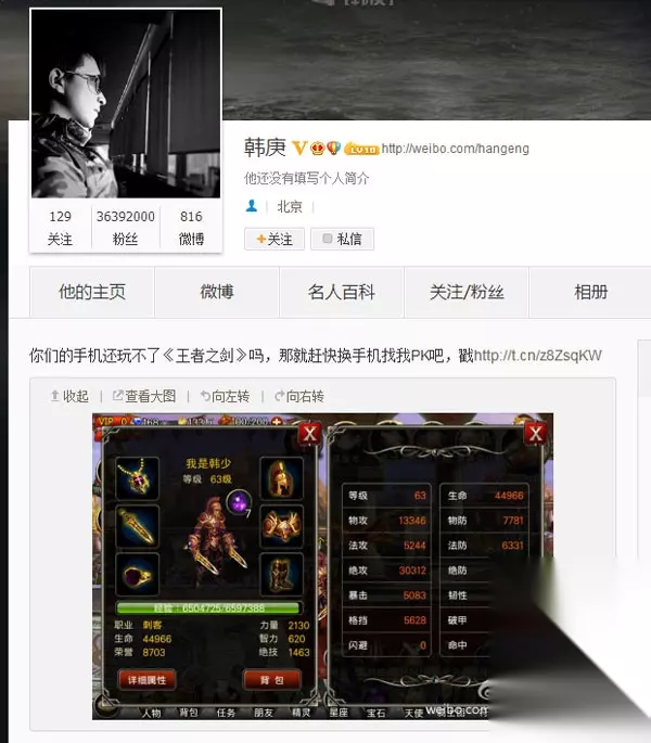 当超人气流行歌手邂逅最火爆的手游,将会擦出怎样的火花? 8月28日晚《王者战魂》各大区服登陆人数暴涨原因何在? “韩少你在哪里”、“庚宝宝我爱你”…两天以来游戏公聊频道此起彼伏的刷屏,又是从何而来? 8月28日下午17点16分,亚洲知名流行歌手韩庚的一条图文微博“你们的手机还玩不了《王者战魂》吗?那就赶快换手机找我PK吧!