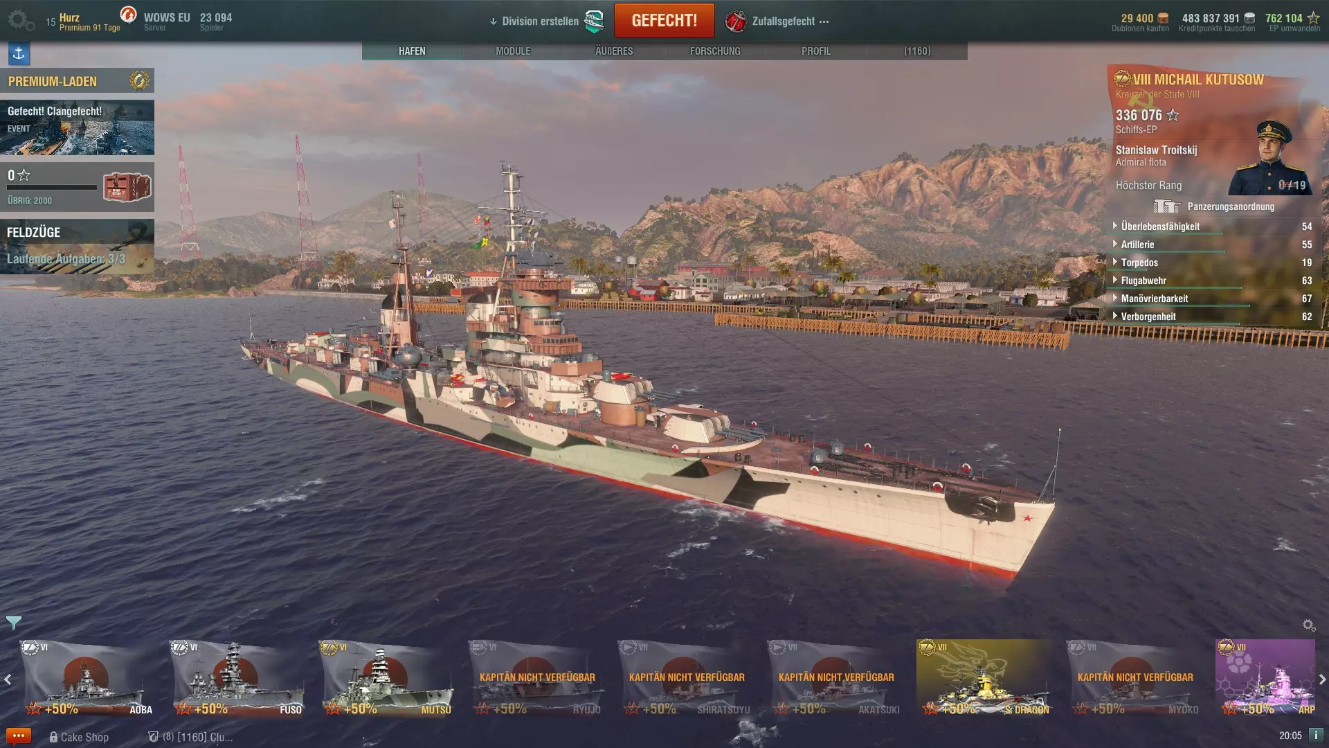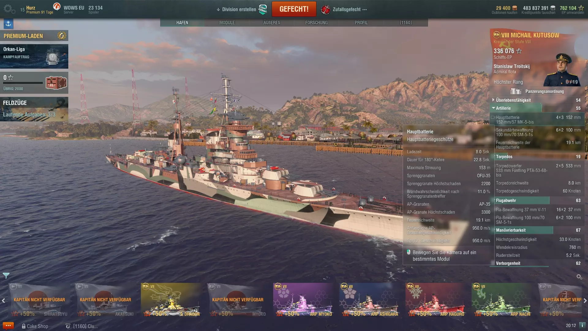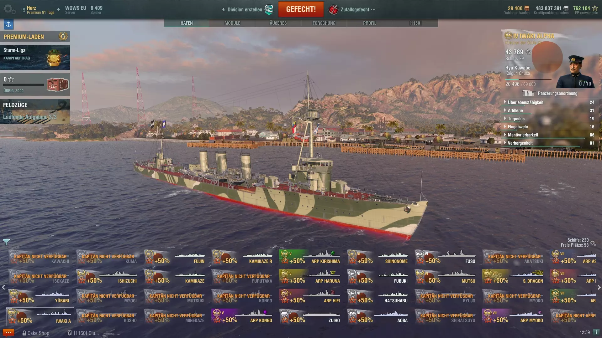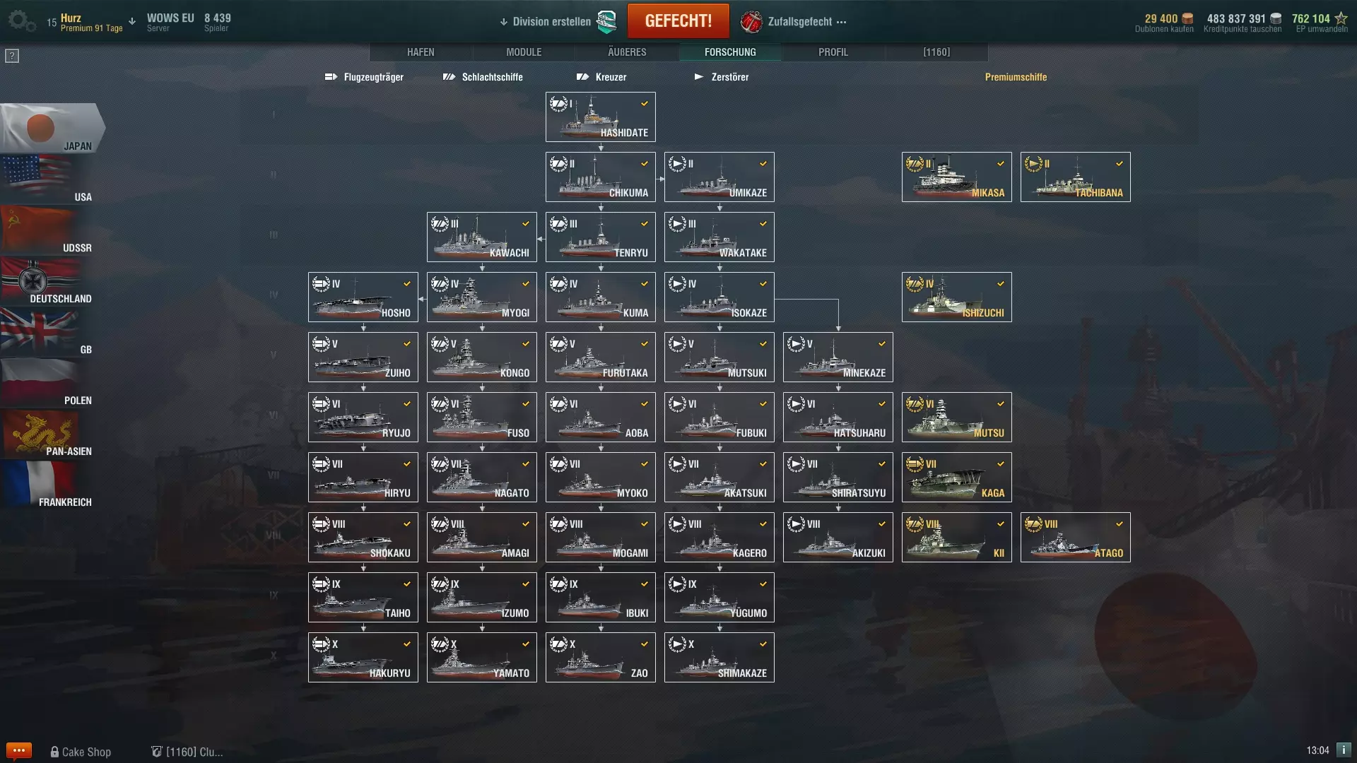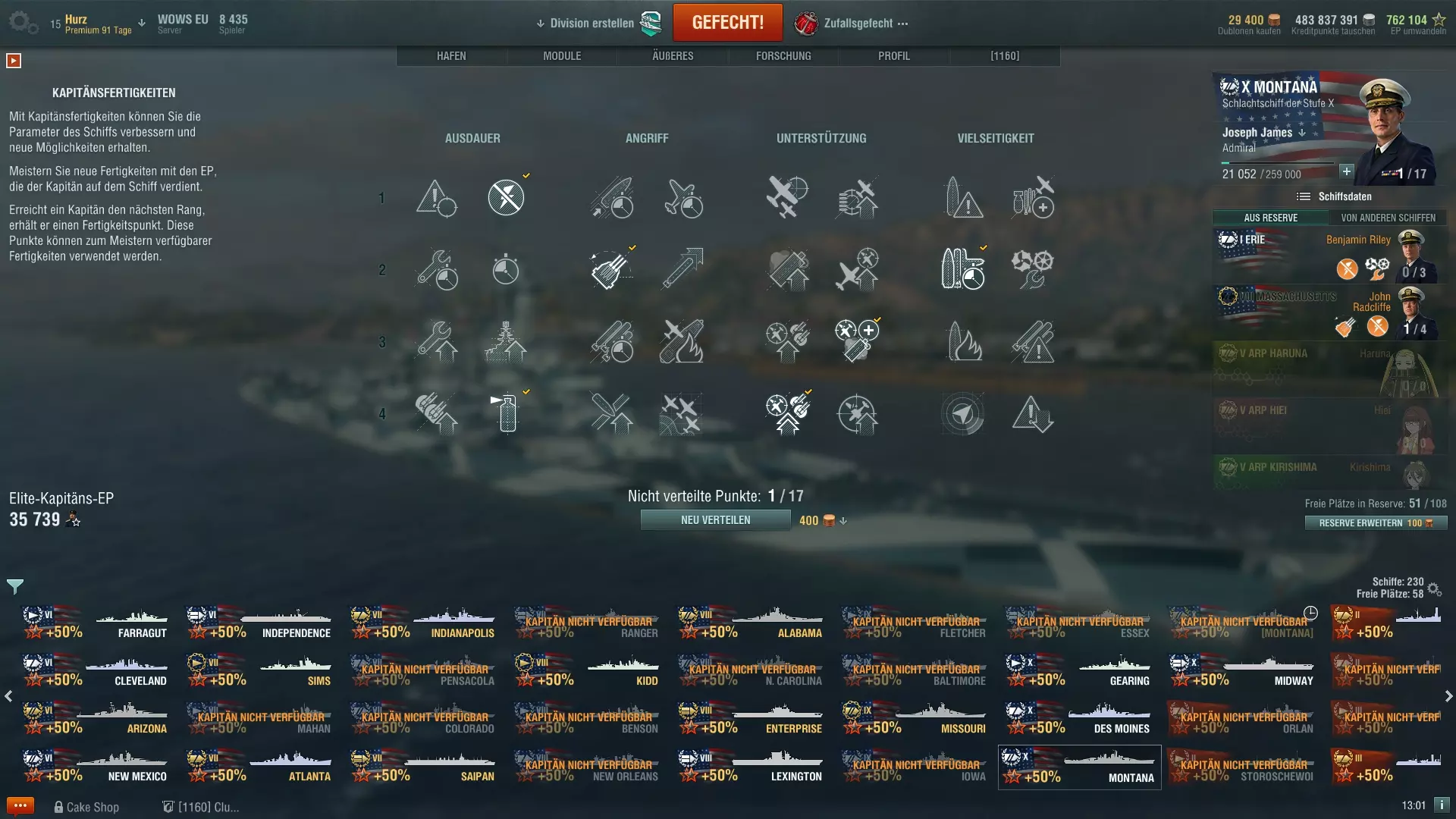 Ein Kapitän, der auf einem Schiff voll eingewiesen ist, erhält aus jedem Gefecht die gleichen Erfahrungspunkte für seinen Karrierefortschritt, die man mit dem Schiff erspielt hat. Dabei ist es egal ob man versenkt wurde oder nicht, denn obwohl ein Kapitän bekanntlich mit seinem Schiff unter geht, werden Erfahrungspunkte in voller Höhe ebenso dem Fortschritt des Schiffs, als auch dem des Kapitäns gut geschrieben. Hier eine Tabelle mit der Erfahrung die ein Kapitän für das Erreichen der jeweils nächsten Stufe benötigt: StufeErfahrungStufeErfahrung11.5001169.00022.5001287.00034.00013108.00046.00014132.00059.00015159.000614.00016189.000721.00017222.000830.00018259.000941.00019300.0001054.000 Wer auf jedem Schiff einen neuen Kapitän anfängt und nicht den des Vorgängers übernimmt, der wird womöglich schnell merken, dass er Gegnern in gleichen Schiffen mit besseren Kapitänen ein wenig unterlegen ist. Daher empfehle ich den Kapitän immer zu übernehmen und auf das neue Schiff einzulernen, wobei es nicht zwingend die 500 Dublonen teure 100% Variante sein muss. Wie schon im ersten Teils meines Überblicks zu den Premium-Schiffen geschrieben (siehe hier[www.wirsinken.de]), kann man diese nutzen um die Umschulung eines Kapitäns günstiger zu gestalten: man nimmt den Kapitän der Cleveland und setzt ihn in die neu gekaufte Pensacola und nutzt die 0% (kostenfrei) oder 50% (200.000 credit) Umschulungsoption; dann setzt man diesen Kapitän sofort auf die Atlanta und fährt damit einige Runden, bis der Kapitän wieder bei 100% ist; zuletzt wird der Kapitän wieder auf die Pensacola transferiert und beginnt dort seinen Dienst so, als hätte man 500 Dublonen für die 100% Schulung ausgegeben. Da es den Rahmen dieses Einsteiger-Guides sprengen würde über die einzelnen Fähigkeiten genauer zu sprechen, möchte ich auf meine Guides zu den Fähigkeiten des Kapitäns auf meinem Blog[www.wirsinken.de] verweisen. Es gibt einmal einen Überblick über alle Fähigkeiten[www.wirsinken.de] und dann Empfehlungen und Beispiele für reguläre Schiffe[www.wirsinken.de] und Premium-Schiffe[www.wirsinken.de]. Der Überblick bespricht alle Fähigkeiten eher allgemein und gibt einen Rat für welche Schiffe welche Fähigkeit primär sinnvoll ist während die Beispiele ganz konkret als Vorlagen gedacht sind. Ich merke gleich an, dass diese Beispiele zwar fundiert und mit besten Wissen erstellt sind, aber natürlich auch meine persönlichen Vorlieben wiederspiegeln. Neuen Spielern oder Spielern die noch wenig Erfahrung mit einem Schiff haben sollen diese als Anregung und Basis dienen, aber immer mit der Maßgabe, dass eine Anpassung an die persönlichen Vorlieben durchaus sinnvoll ist. 6. Womit fange ich an? Fängt man bei WoWS neu an, so steht einem eh nur eine Klasse zur Verfügung, nämlich die Kreuzer der Stufe 1 der jeweiligen Nation. Diese Schiffe sind der Ausgangspunkt für die gesamte Forschung und erlauben es wunderbar den Einstieg in das Spiel zu finden. Da diese Schiffe kostenlos sind, die Betriebskosten (Reparatur, Munition, etc.) nach den Gefechten minimal und auch die Folgeschiffe schnell erforscht sind, besteht hier kein Risiko sich irgendwie falsch zu entscheiden. Im Zweifel spielt man einfach ein oder zwei weitere Runden mit einem Schiff einer anderen Nation und ist erneut einen Schritt weiter. Allerdings ist nicht jede Art von Schiffen in gleicher Weise für frische Kapitäne geeignet und schon gar nicht für jeden Spielertyp, daher ist eine grobe Einschätzung vielleicht hilfreich an dieser Stelle: NationKlasseStärkenSchwächenEmpfehlungAmerikaZerstörer[www.wirsinken.de]* gute Geschütze * guter Nebel* schwache Torpedos * anfangs schlechte Sichtbarkeiteher für FortgeschritteneAmerikaKreuzer[www.wirsinken.de]* gute panzerbrechende Munition * gute Flugabwehr * später Radar* meist keine Torpedos * schwache Panzerunggut für den EinstiegAmerikaSchlachtschiffe[www.wirsinken.de]* gute Flugabwehr * später genaue Geschütze* anfangs langsamgut für den EinstiegAmerikaFlugzeugträger[www.wirsinken.de]* gute Jäger * großer Hangar* wenig Staffelnsehr spezielle SpielweiseDeutschlandZerstörer[www.wirsinken.de]* Allrounder * später Sonar* später schwache Torpedos * kurzer Nebeleher für FortgeschritteneDeutschlandKreuzer[www.wirsinken.de]* gute panzerbrechende Munition * später Sonar* schwache Panzerungeher für FortgeschritteneDeutschlandSchlachtschiffe[www.wirsinken.de]* gute Panzerung * gute Sekundärgeschütze* geringe Reichweite der Hauptgeschützegut für den EinstiegEnglandKreuzer[www.wirsinken.de]* früh Nebel * geringe Sichtbarkeit* keine Panzerung * nur panzerbrechende Munitioneher für FortgeschritteneEnglandSchlachtschiffe[www.wirsinken.de]* sehr effektive Granaten * später sehr gute Reparatur* langsam * wenig Trefferpunkteeher für FortgeschritteneFrankreichKreuzer[www.wirsinken.de]* sehr schnell * später mit Motorboost* schwache Panzerungeher für FortgeschritteneJapanZerstörer[www.wirsinken.de]* geringe Sichtbarkeit * gute Torpedos* schwache Geschützegut für den EinstiegJapanKreuzer[www.wirsinken.de]* gute hochexplosive Munition * gute Torpedos* anfangs träge Geschütze * später kein Radargut für den EinstiegJapanSchlachtschiffe[www.wirsinken.de]* schnell * genaue Geschütze* Schwachstellen in der Panzerung * schwächere Luftabwehrgut für den EinstiegJapanFlugzeugträger[www.wirsinken.de]* viele Staffeln* weniger Flisteger pro Staffelsehr spezielle SpielweiseRusslandZerstörer[www.wirsinken.de]* sehr schnell * gute Geschütze* hohe Sichtbarkeit * teils schwache Torpedoseher für FortgeschritteneRusslandKreuzer[www.wirsinken.de]* hohe Reichweite der Geschütze * später Radar* schwache Panzerung * meist kleines Kalistber der Geschützeeher für Fortgeschrittene Die Links bei jeder Klasse führen auf die ausführlichen Vorstellungen des jeweiligen Forschungszweiges auf meinem Blog[www.wirsinken.de], die ihr dort auch über das Menü Guides => Überblick zu den Schiffen f