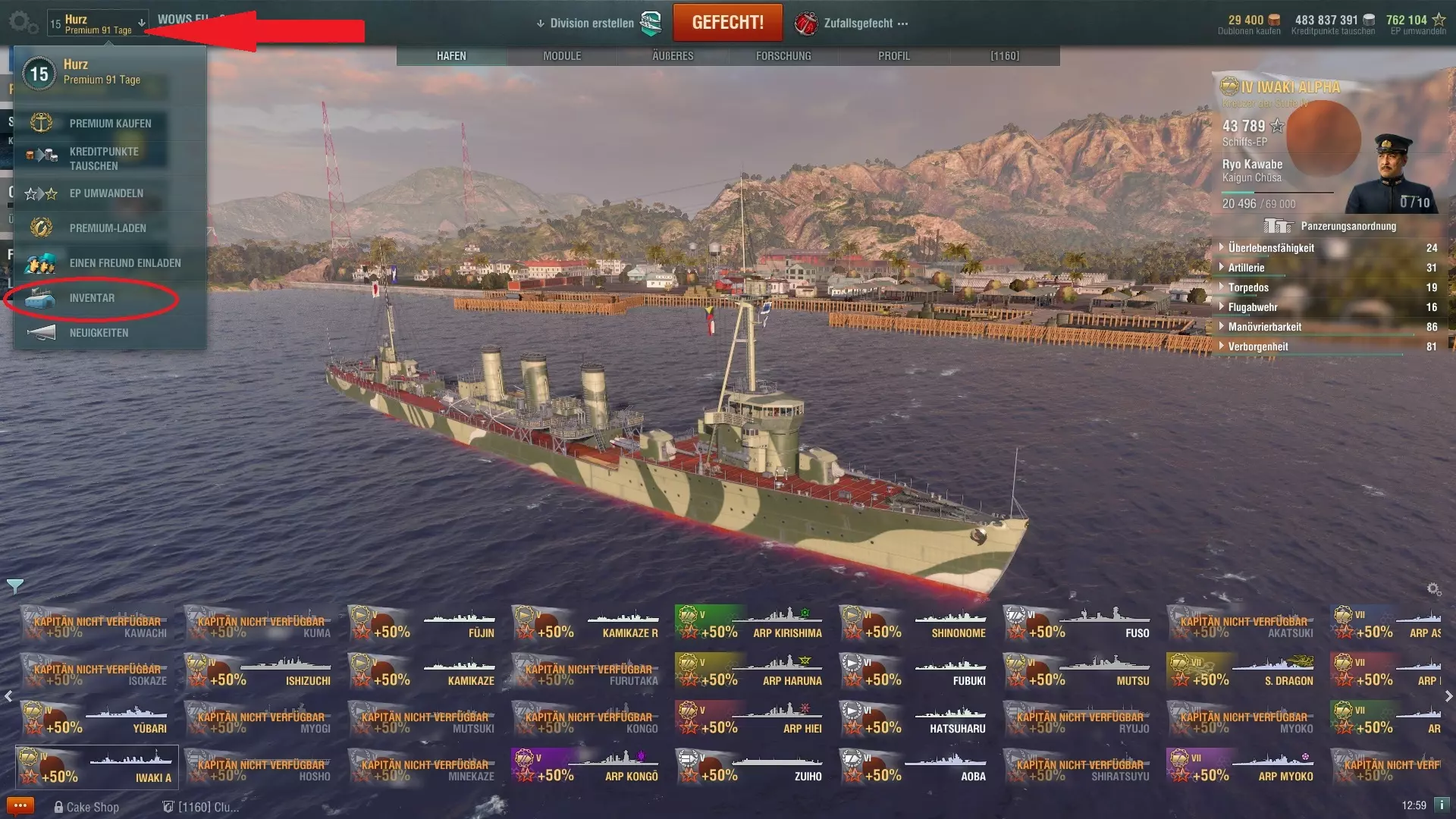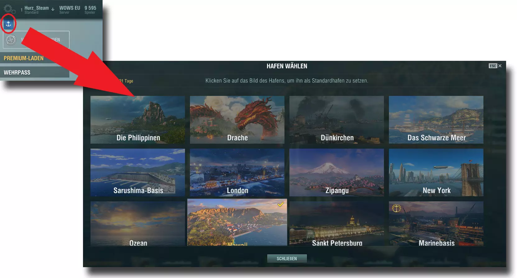 港口中有一些显而易见的内容,比如下方区域显示你当前拥有的舰船、顶部中央闪烁的橙色战斗按钮,以及右侧显示的所选舰船信息。还有一些稍隐蔽但实用的功能,例如:左上角可以选择港口背景(如果你不再喜欢当前背景的话)。