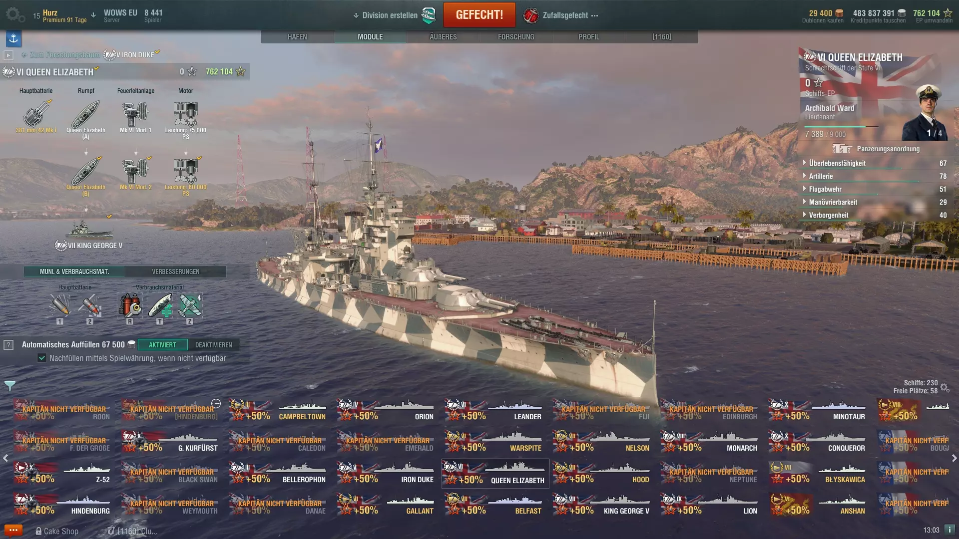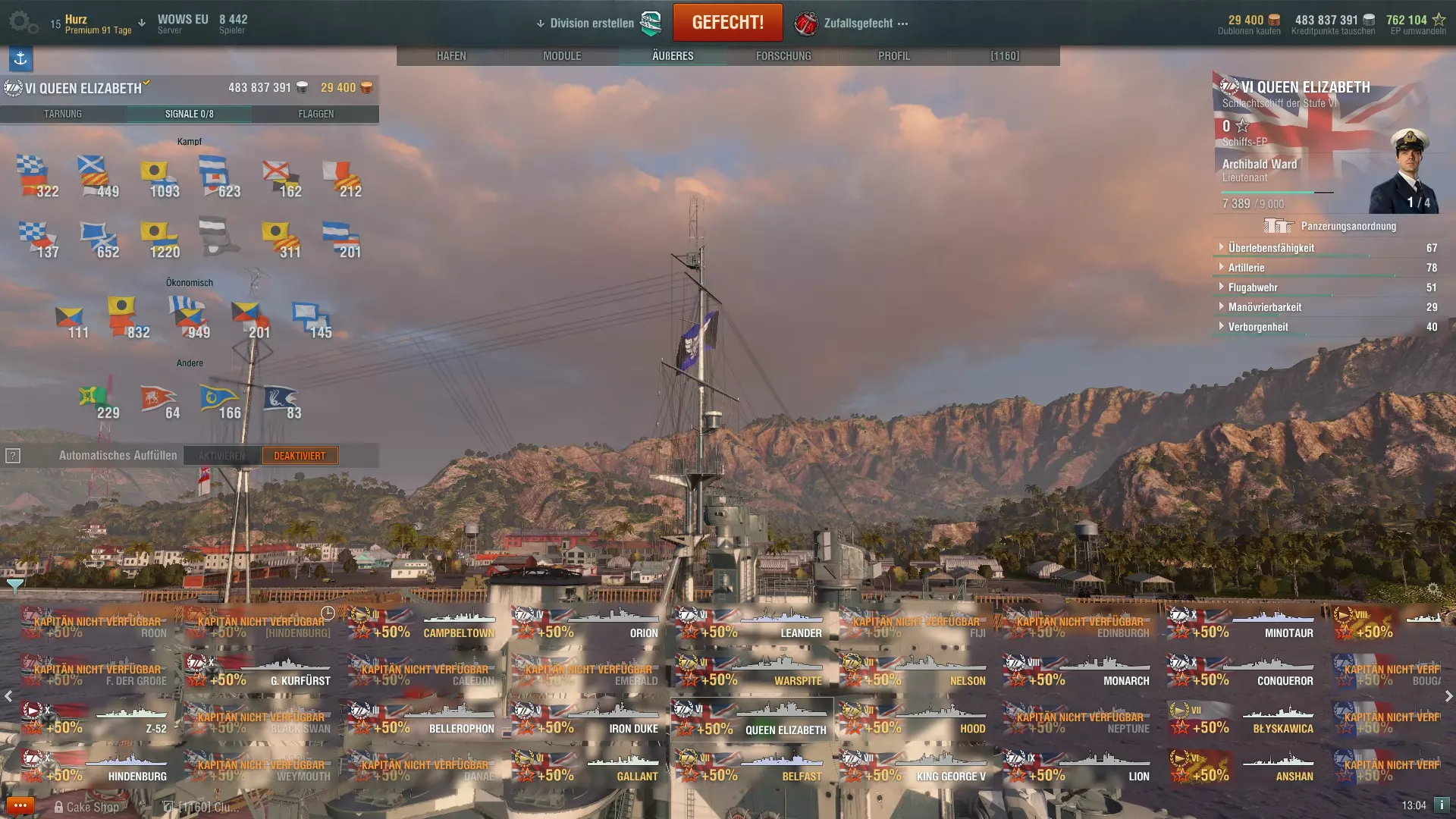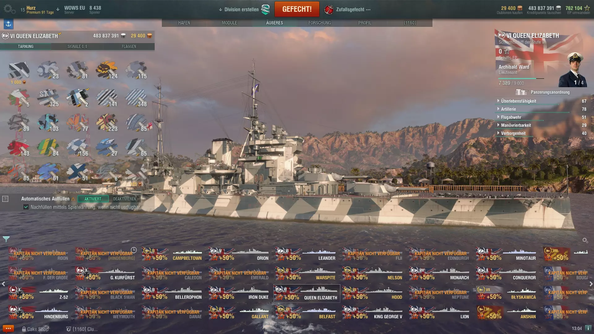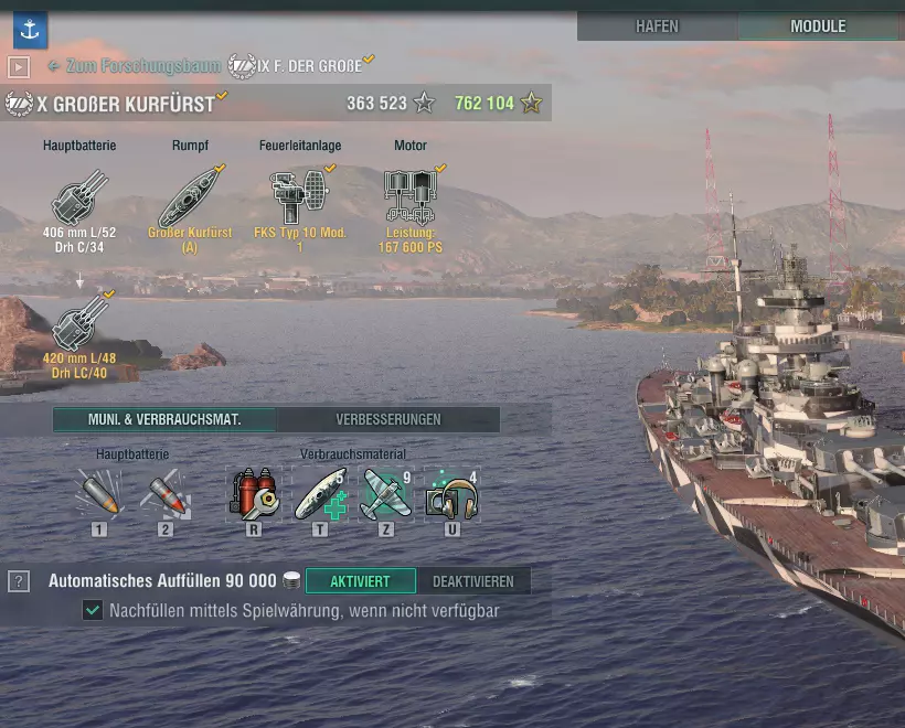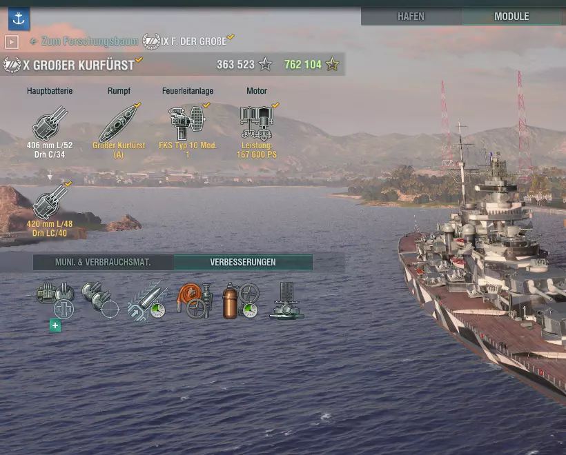 涂装:没有涂装的船只通常看起来有些单调,因此游戏中有多种不同的涂装可供选择。涂装需要在每回合后重新设置(可以设置为自动进行),部分涂装还能为船只带来正面效果。有些涂装可以增加收益加成,或者降低船只的可见性。涂装需要消耗 credits(游戏币)或 Dublonen(金币),因此每回合后都需要付费,但可以关闭自动购买功能,这样涂装只会持续使用到库存耗尽为止。