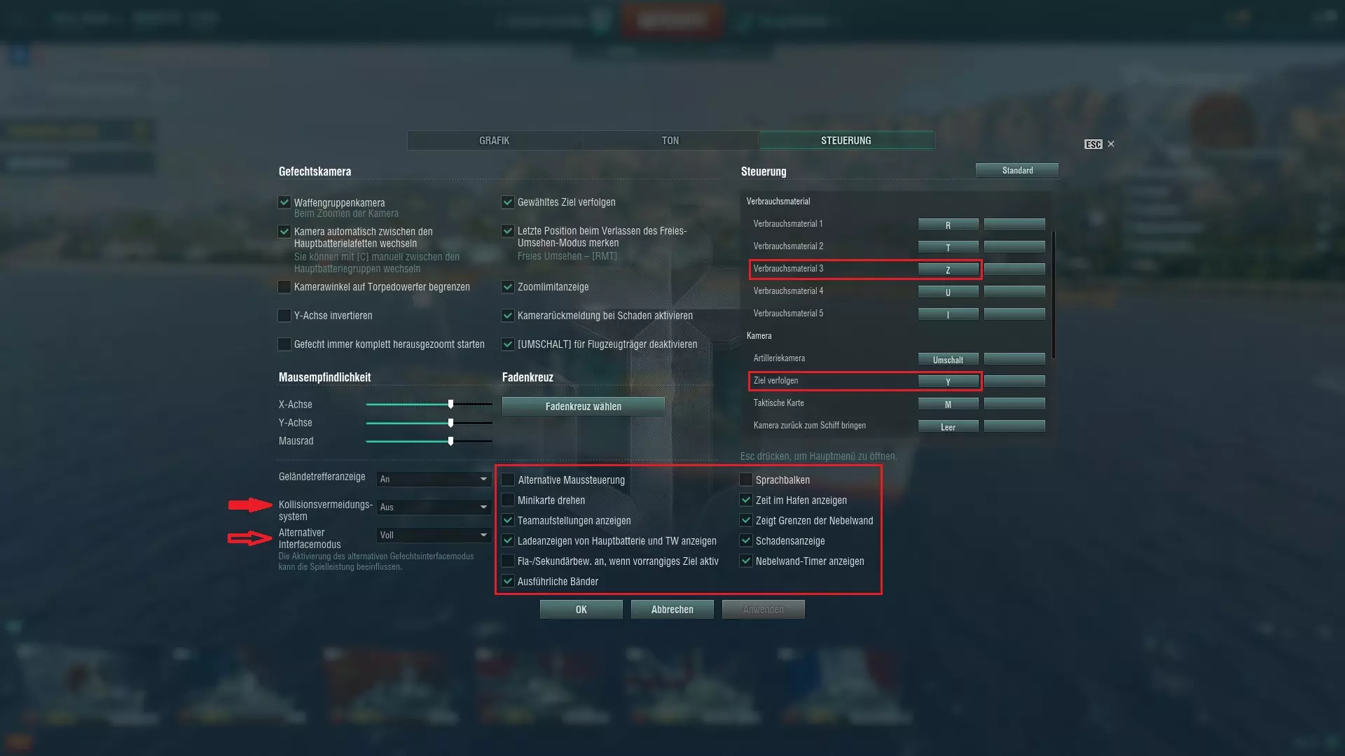 核心观点:首先必须明确,在《战舰世界》中采用“不占点只杀人”的玩法会带来极大的失败风险。由于胜利带来的经验和银币总是比失败多,所以在《战舰世界》中应始终以获胜为目标。归根结底,采用愚蠢的“不占点只杀人”玩法获得的分数,会比多造成一些伤害但伴随更多失败的情况更少。《战舰世界》同样是团队游戏:所有人共同胜利,也共同失败。此外,通常情况下,追逐逃跑的航空母舰而不去占领基地,所带来的分数会比因敌方驱逐舰潜入己方基地而错失的胜利更少。2 界面显示 这里我不会详细介绍战斗中界面显示的每一个细节,因为WG不仅制作了相关的新手任务,还在其网站上提供了一些非常清晰易懂的教程。这些教程涵盖了基础知识、操作方法以及战斗结果相关的所有内容,因此我建议大家参考这些官方资源。不过,有一些小细节可能会对大家有所帮助,而且这些内容是在教程发布后新增到游戏中的。例如小地图新增了一些功能,还有部分设置对于流畅的游戏体验而言并非最佳。设置 - 我强烈建议更改的按键映射是消耗品3,它默认设置在Y键,而其他消耗品按键(R、T、U)的位置离它很远。这与英文键盘有关,英文键盘上Y键的位置在我们的键盘上是Z键。因此,我建议将追踪目标(通常绑定在Z键)和消耗品3的按键互换,这样消耗品就能按预期排列在一条直线上。 设置 - 自动避障系统非常糟糕,所以应该关闭它。使用这个系统时,通常碰撞会比不使用时更多。设置 - 替代界面模式应设为【完全】,只有这样才能随时查看关于舰船和目标的完整信息。 设置 - 还有一些可以调整的设置,但在我看来最合理的选项已在图片的大方框中标记出来,这样可以获得最多信息并保持最佳的全局视野。此外,例如通过在优先目标激活时禁用防空/副武器自动瞄准,可以避免在驱逐舰上因预先标记了轰炸机而不小心开始射击飞机,从而导致被发现。此外,固定小地图(即不会旋转的小地图)显然更适合与队友交流——当你想从某个方向警告危险时,如果每个人看到的方向都不一样,那没有什么比这更令人困惑的了。