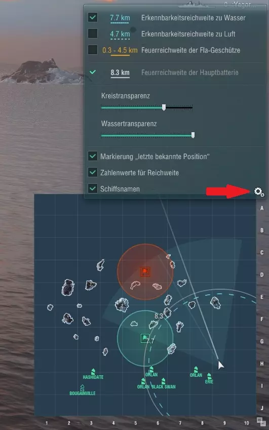 两个重要按键——在德语键盘上是CTRL或STRG键,以及H键,这是游戏中经常需要用到的两个按键。按住H键,屏幕右侧会显示舰船的概览信息,包括所有可能的数据。其中还包括从星云开火时何时会被发现、还有多少副炮处于激活状态及其射程,以及防空系统的状态。按住CTRL或STRG键可以使用鼠标,只要按住该键,就会出现一个普通的鼠标指针。这样你就可以例如标记(点击)敌方舰船和飞机,并将其设为副炮和防空炮的主要目标。此外,你可以查看自己的武器和消耗品,并查询更多信息(如每发炮弹的伤害、装填时间等)。 小地图 - 可以使用小键盘上的+和-键放大或缩小游戏中的小地图,我建议从一开始就至少把它调大一点。《战舰世界》是一款节奏较慢的游戏,提前估算敌人的移动非常重要,而较大的小地图有助于保持全局视野。 小地图 - 在小地图的右上角(只有在未沉没时可见)有两个小齿轮图标,点击它们(如前所述,用CTRL键激活鼠标指针)可以打开一个小设置菜单。在这里可以设置小地图显示的内容,例如地图上的舰船名称、敌方舰船的最后已知位置,或者武器、声呐、雷达的作用范围以及可见性。启用所有作用范围可能会有些混乱,但我强烈建议启用如下方图片所示的三个下方选项。