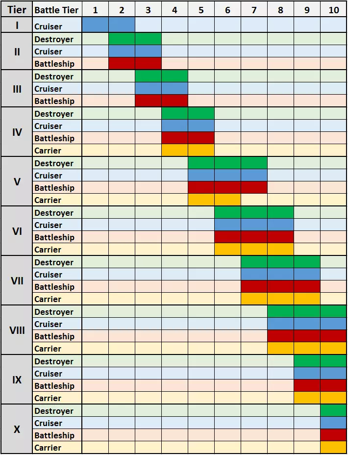 《战舰世界》将经验分为四类,但所有经验都取决于玩家在一场战斗中获得的基础经验。基础经验会通过诸如高级账号、信号旗、每日首胜等因素进行倍率加成,然后分配到相应的类别中: 1. 舰船经验值:这些点数可用于研发该舰船的模块或解锁下一艘舰船。若舰船已达到精英状态(所有模块和后续舰船均已研发),则可将这些经验值转换为全局经验值。不过,每25点舰船经验值转换需消耗1金币。舰长经验:玩家通过舰船获得的经验会精确计入舰长经验。可通过信号旗、涂装或活动进一步提升。 精英指挥官经验:当舰长达到最高等级(19级)后,此后通过战斗获得的所有经验将转入全局经验池。 自由经验:玩家获得的总经验的5%会额外计入自由经验。自由经验可与舰船的绑定经验一起用于任何舰船的研发和解锁。4.2 舰种——选择、任务与缩写 在《战舰世界》中有四大舰种,在游戏中以不同图标显示(绿色:己方队伍,红色:敌方,黄色:自己的舰船/分舰队队友),且在战斗中承担不同核心任务。玩家在论坛或聊天中会使用舰种的军事缩写,因此了解这些缩写很有帮助: 舰种 图标 缩写 任务 驱逐舰